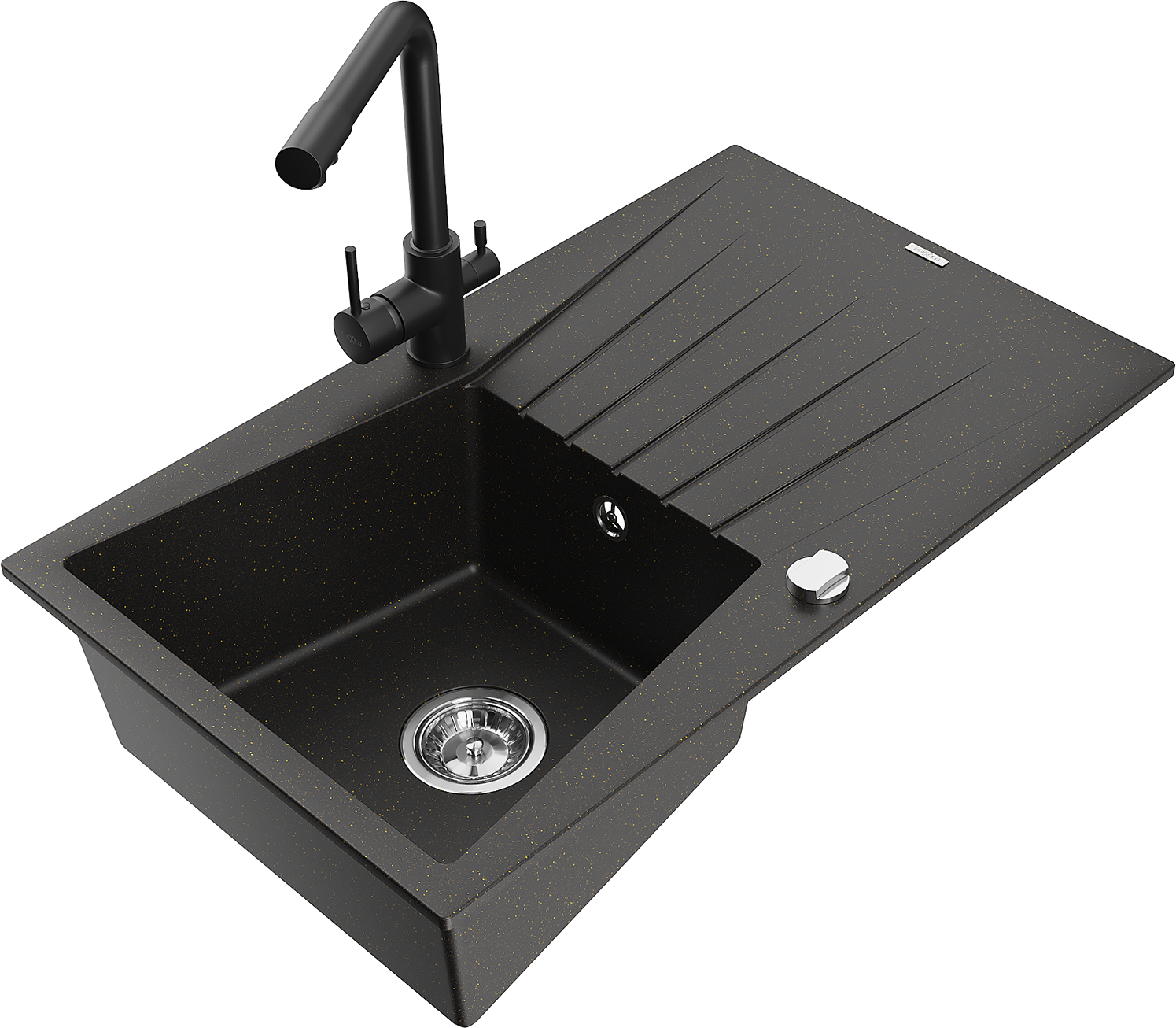 Mexen Cesar lava-loiça de granito de 1 bacia com escorredor e torneira de cozinha Duero, preto/dourado metálico