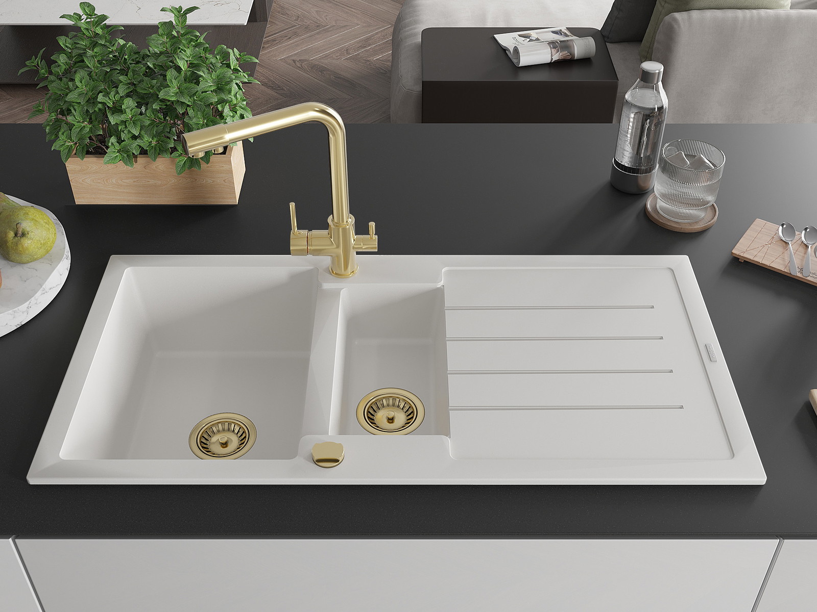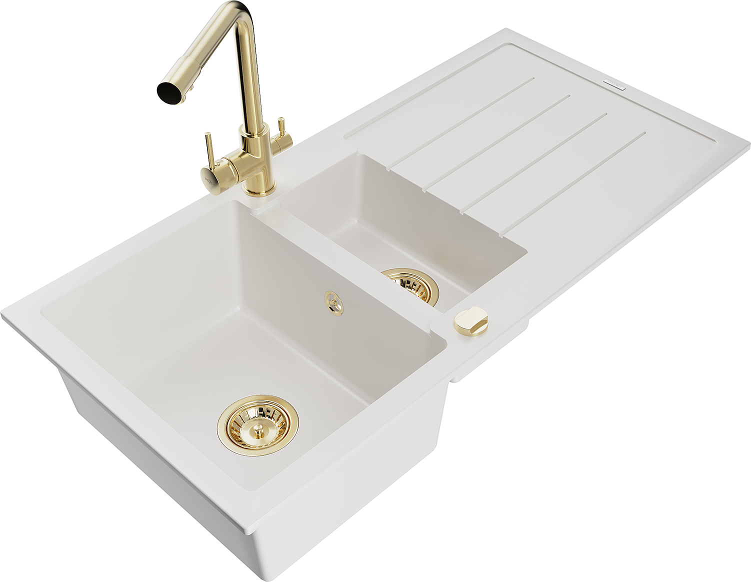 Mexen Andres lava-loiça de granito 1,5-bacia com escorredor e torneira de cozinha Duero, branco - 6515-20-671600-50