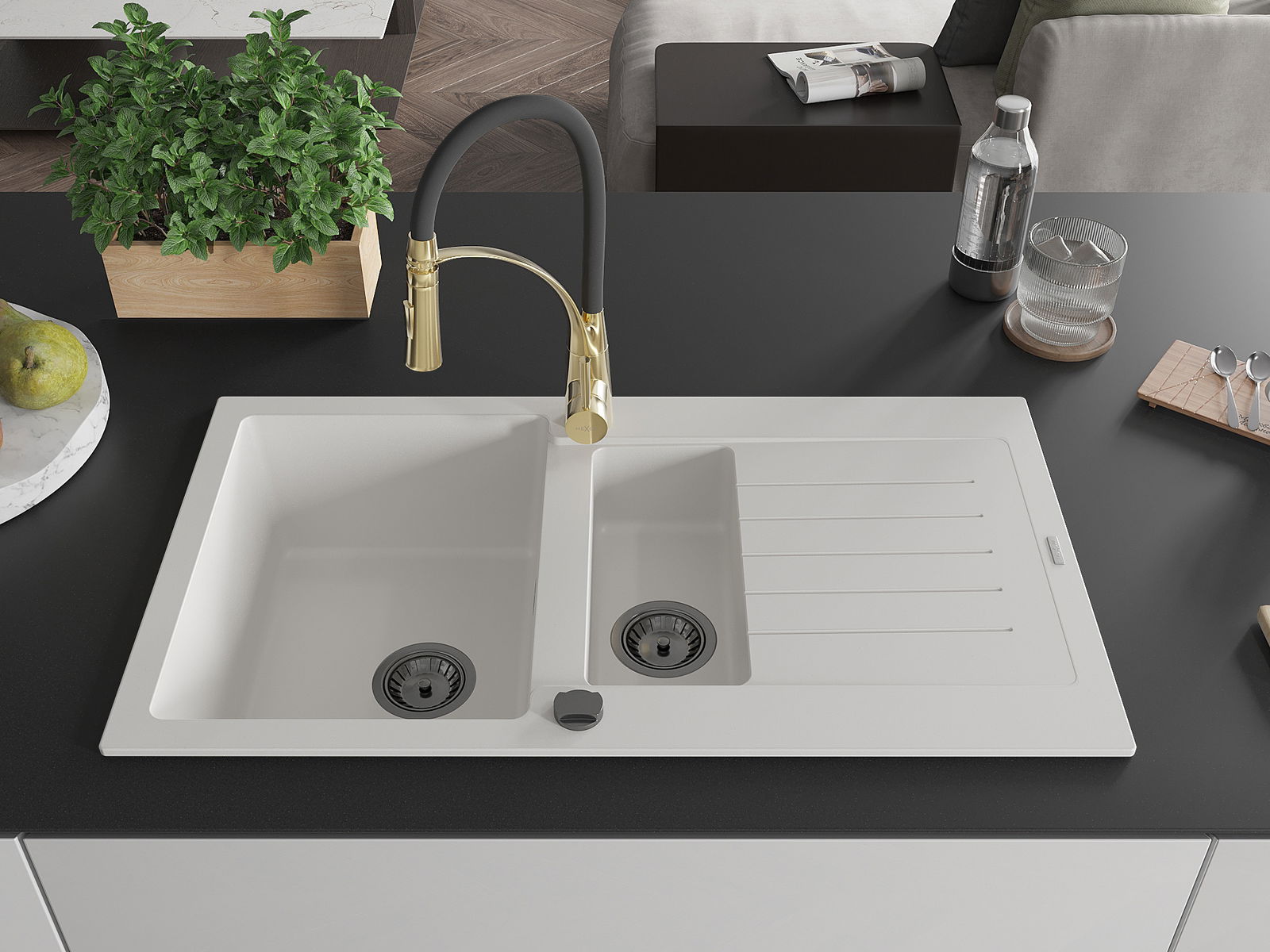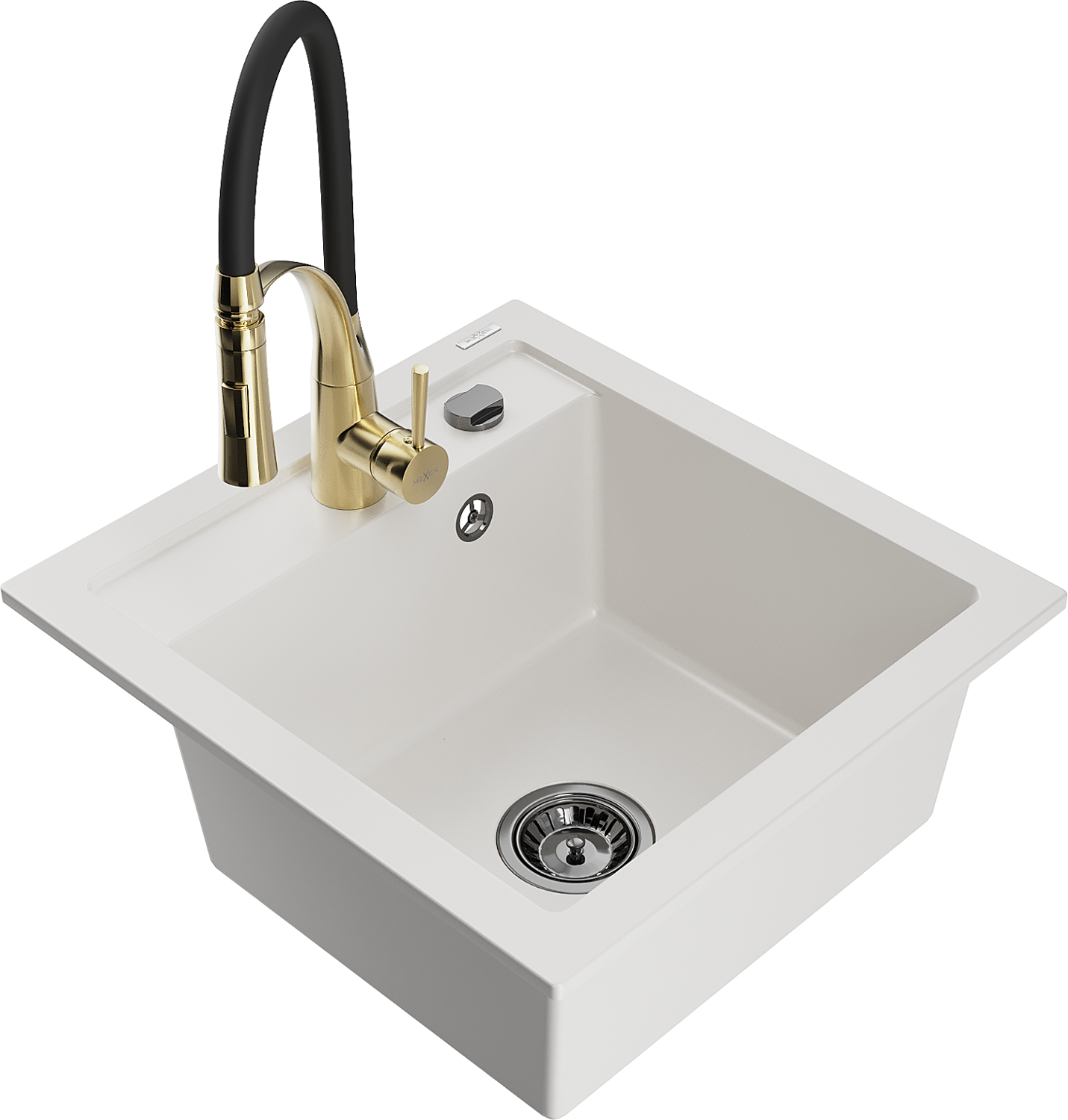 Mexen Matias lava-louça de granito 1,5-cuba com escorredor e torneira de cozinha Aster, branco - 6502-20-73450-57-B