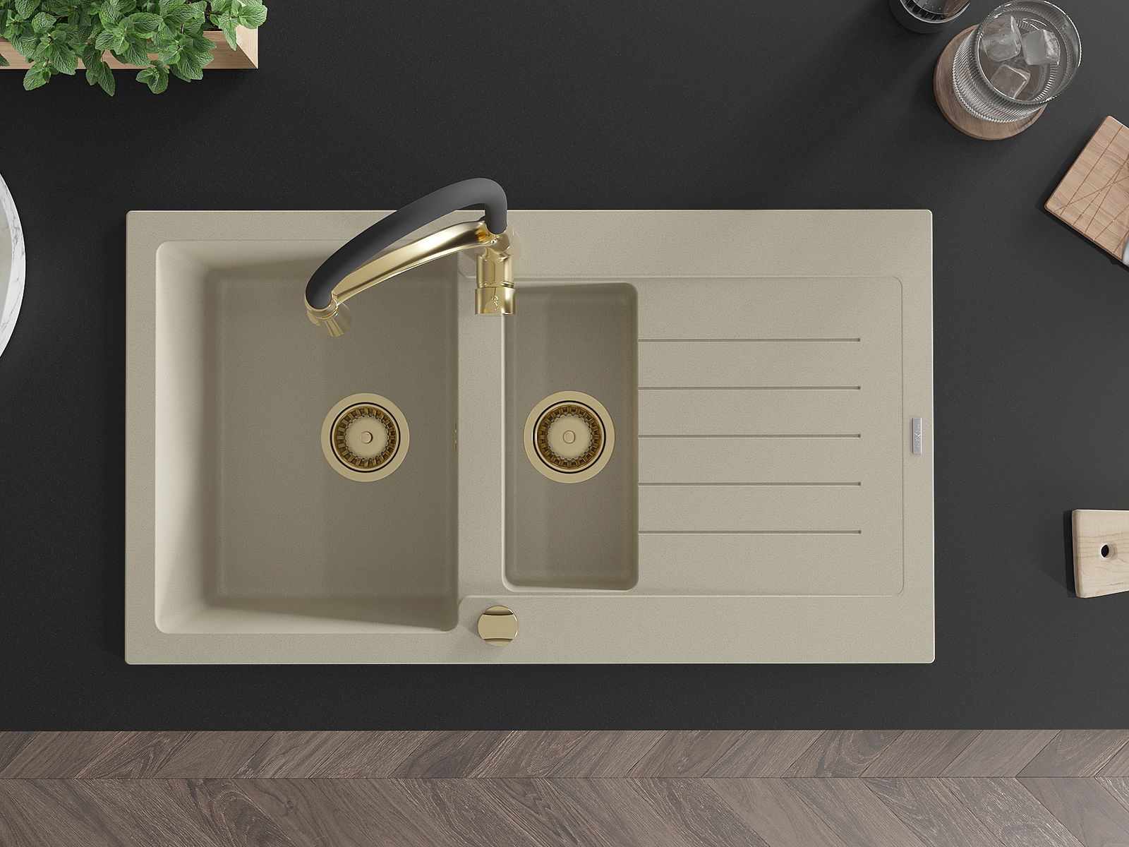 Mexen Matias lava-louça de granito de 1,5 cubas com escorredor e torneira de cozinha Aster, bege - 6502-69-73450-57-G