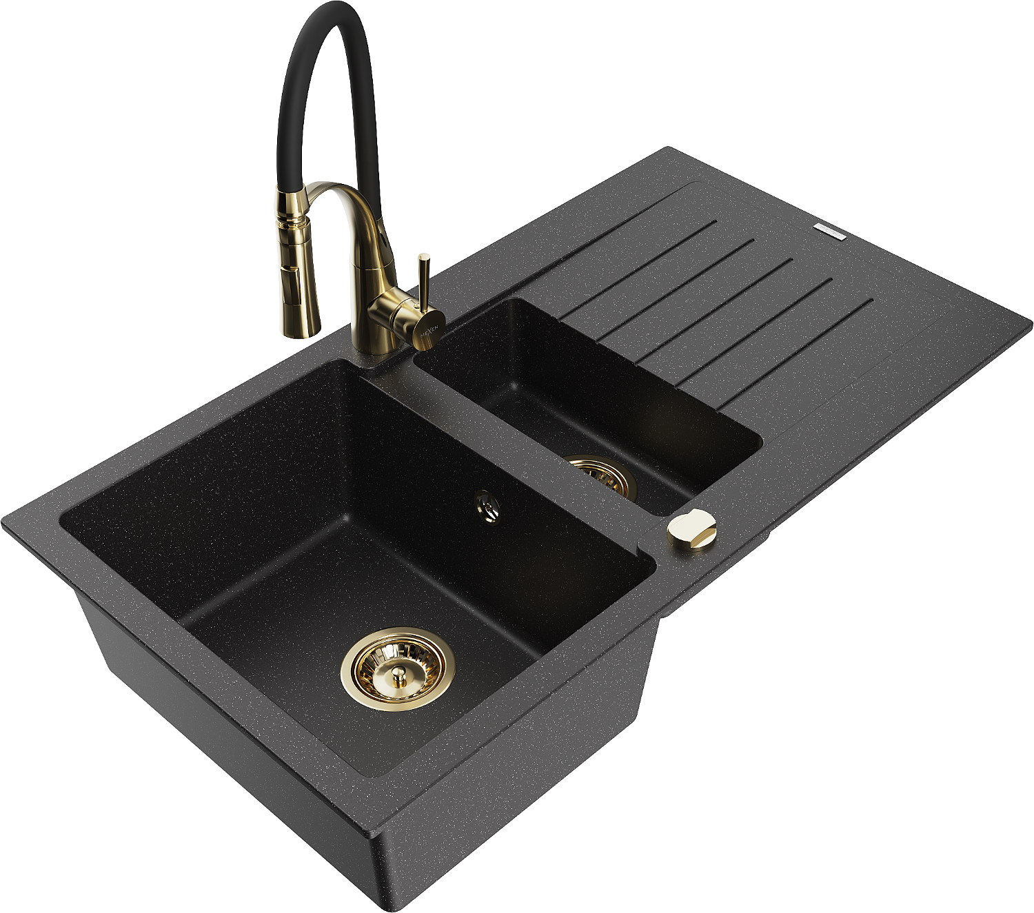 Mexen Matias lava-louça de granito de 1,5 cubas com escorredor e torneira de cozinha Aster, preto/prateado - 6502-73-73450-57-G
