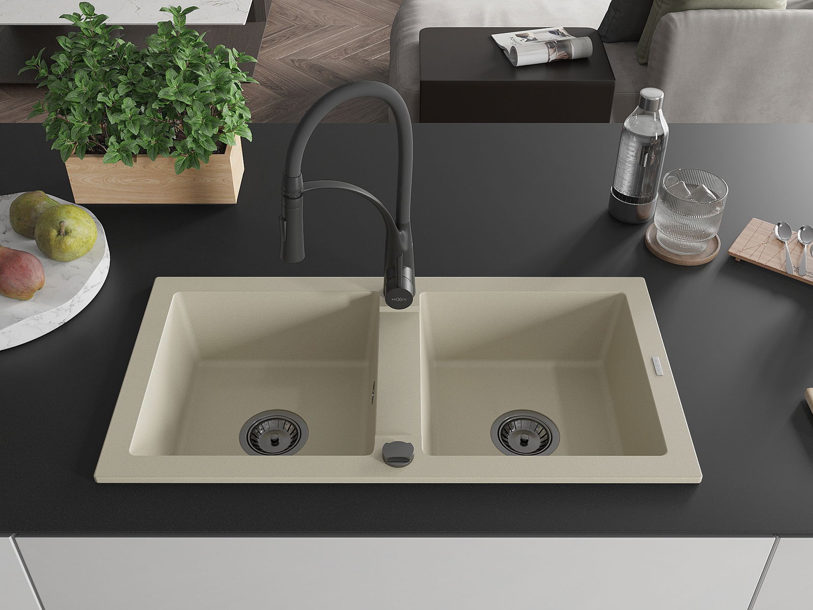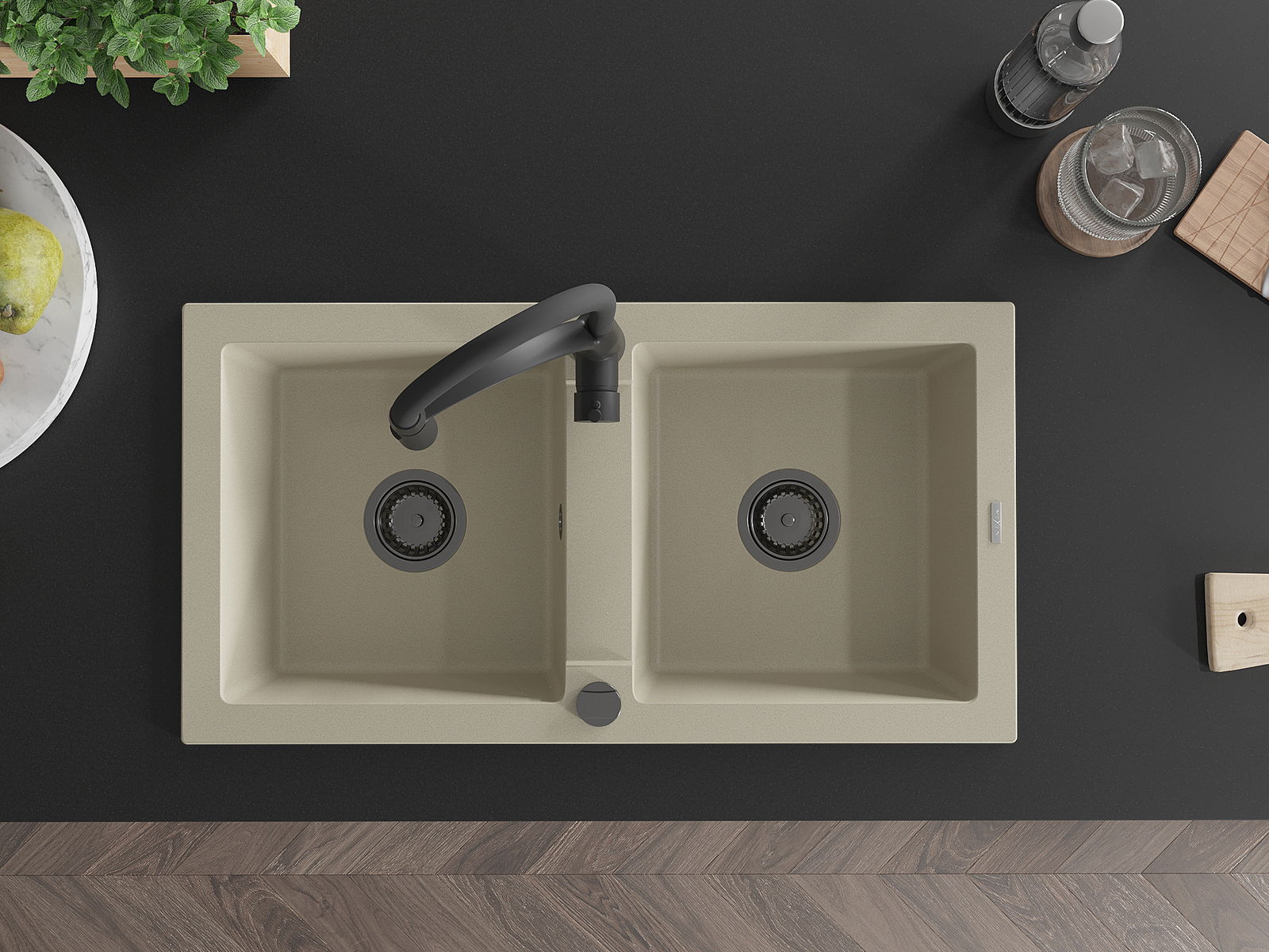Mexen Mario lava-louça de granito de 2 cubas com misturadora de cozinha Aster, bege - 6504-69-73450-70-B