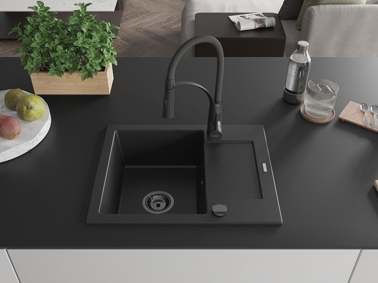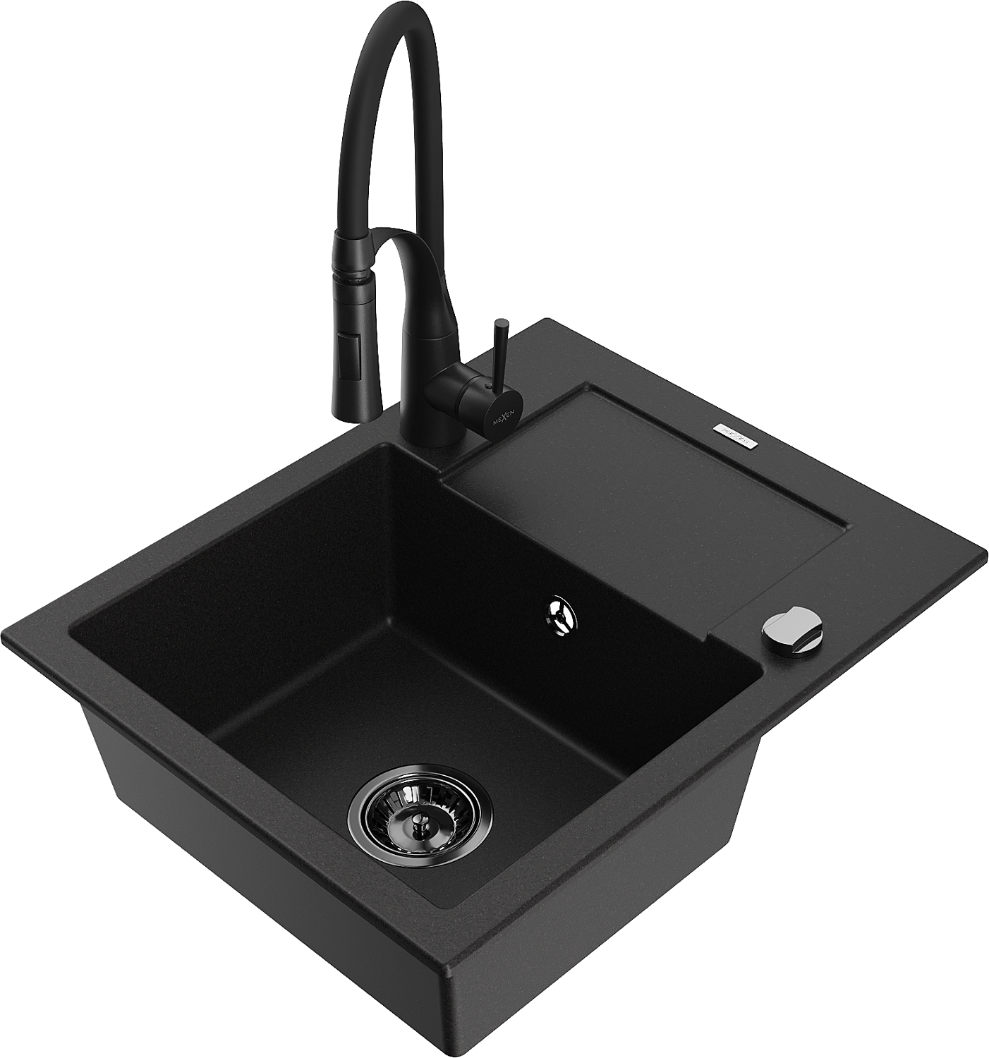 Mexen Enzo lava-loiça de granito com 1 cuba com escorredor e torneira de cozinha Aster, preto - 6506-77-73450-70-B