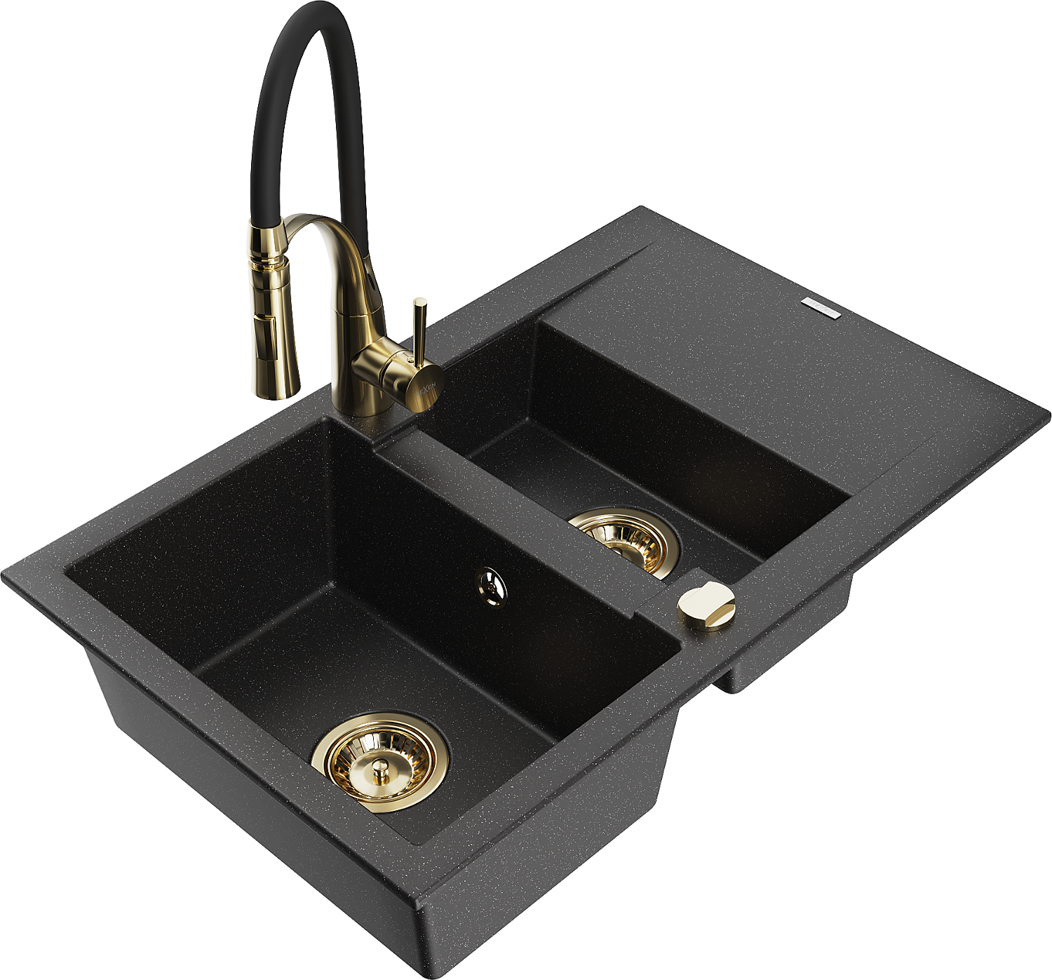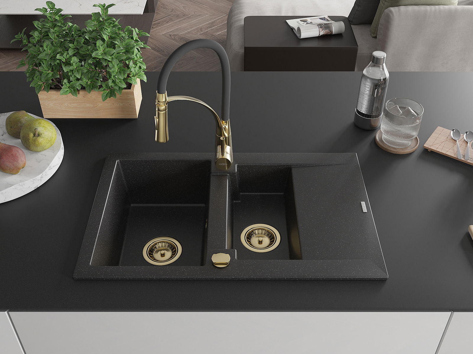 Mexen Gaspar lava-loiça de granito com 1,5 compartimentos com escorredor e torneira de cozinha Aster, preto/prateado
