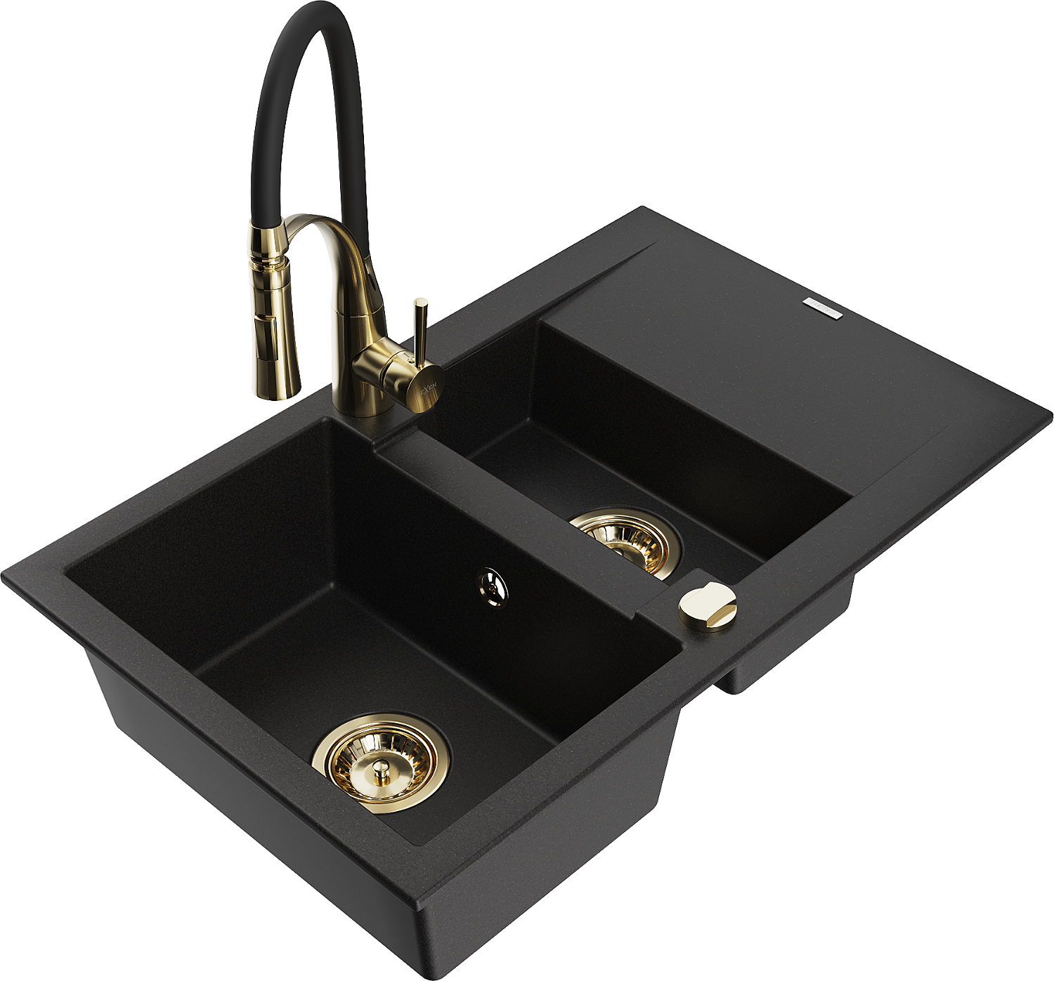 Mexen Gaspar lava-louça em granito de 1,5 bacias com escorredor e torneira de cozinha Aster, preto - 6507-77-73450-57-G