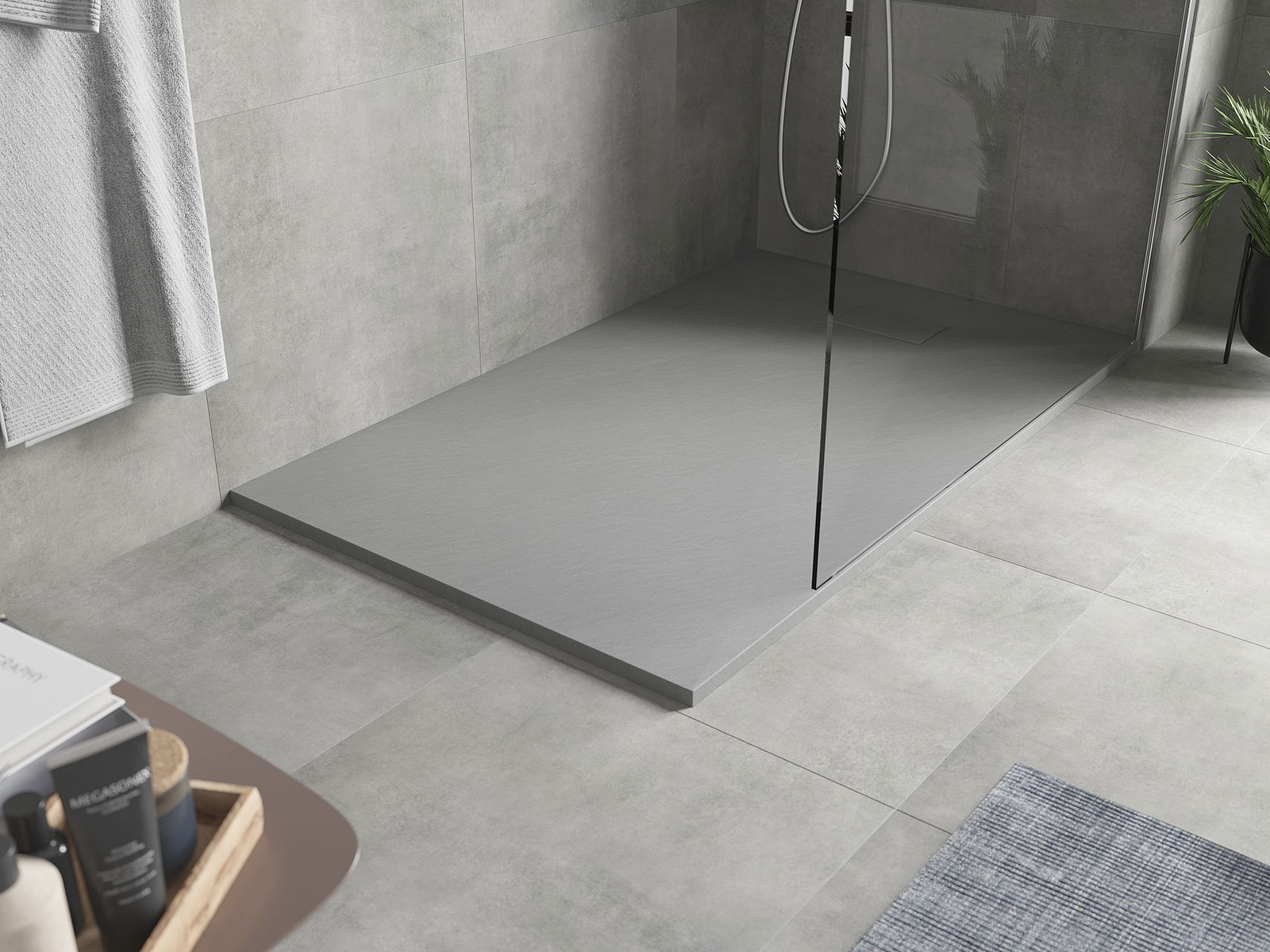 A superfície do tabuleiro do chuveiro assemelha-se a uma pedra na sua estrutura. Constitui uma combinação excecional de aparência natural com um design de interiores moderno. Adiciona caráter, realça a estética e a elegância da decoração da casa de banho e encanta com a sua forma.