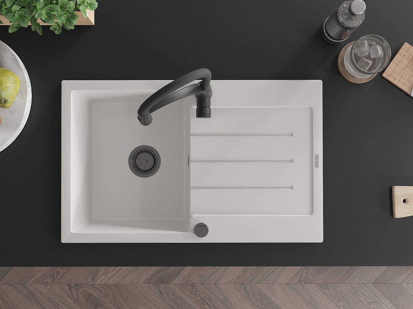 Mexen Bruno lava-louça de granito de 1 câmara com escorredor e torneira de cozinha Aster, branco - 6513-20-73450-70-B