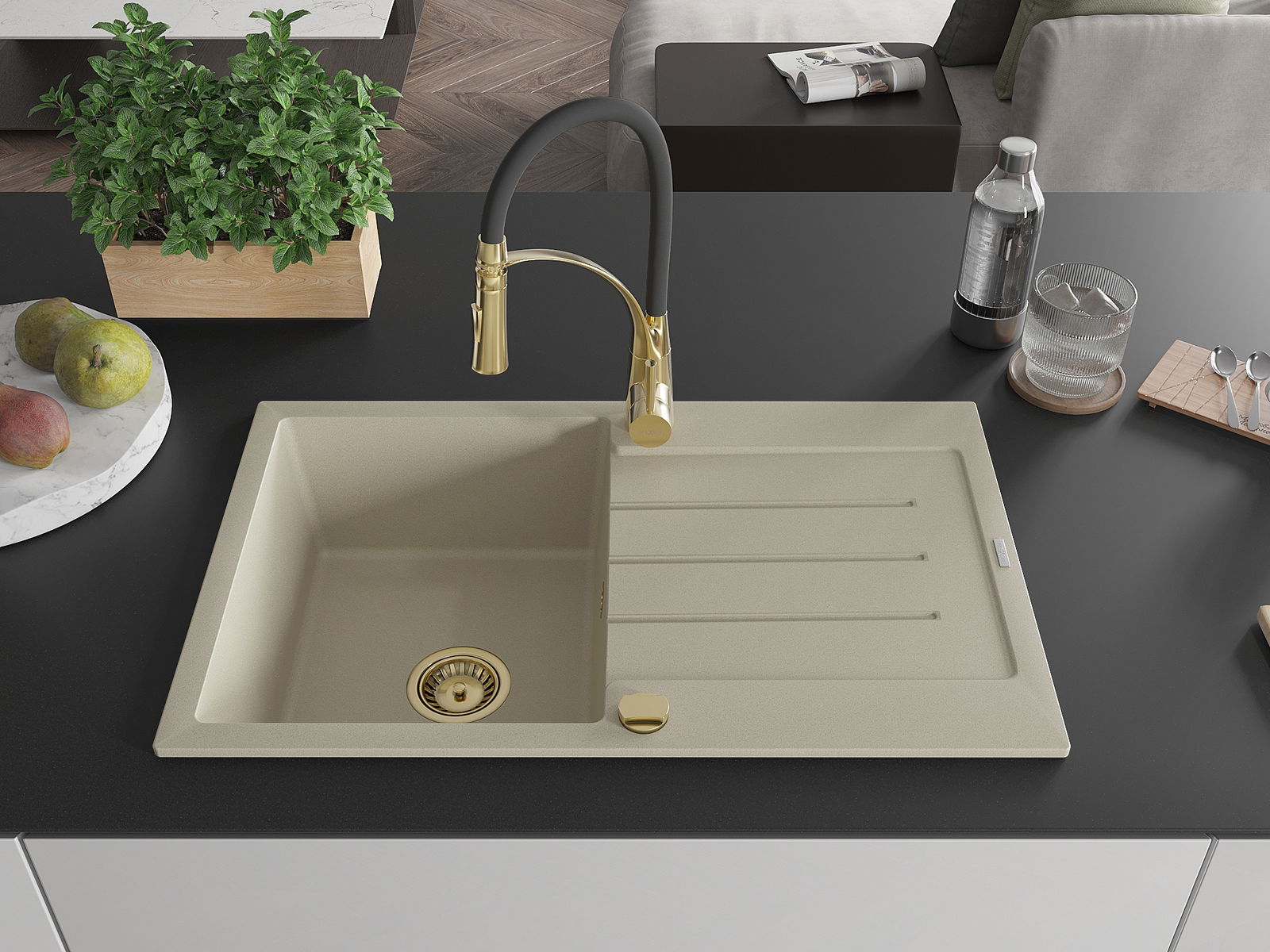 Mexen Bruno lava-louça de granito de 1 cuba com escorredor e torneira de cozinha Aster, bege - 6513-69-73450-57-G