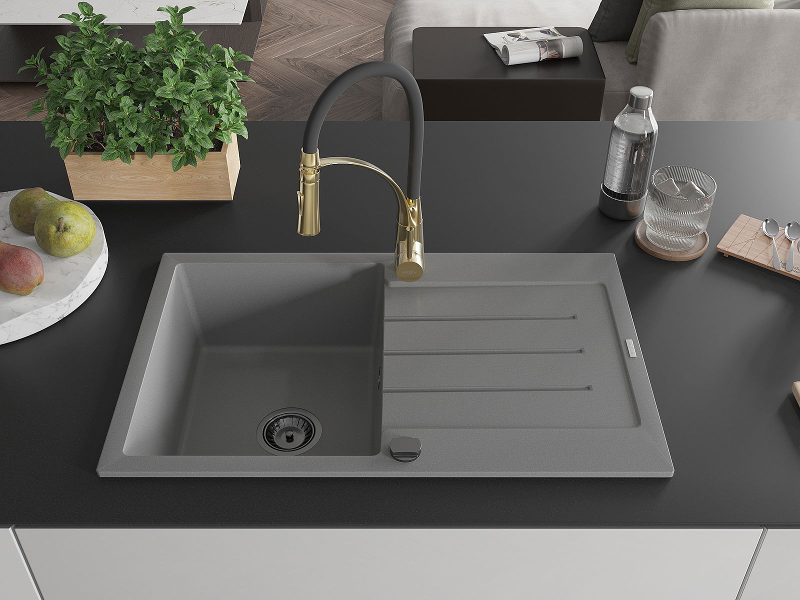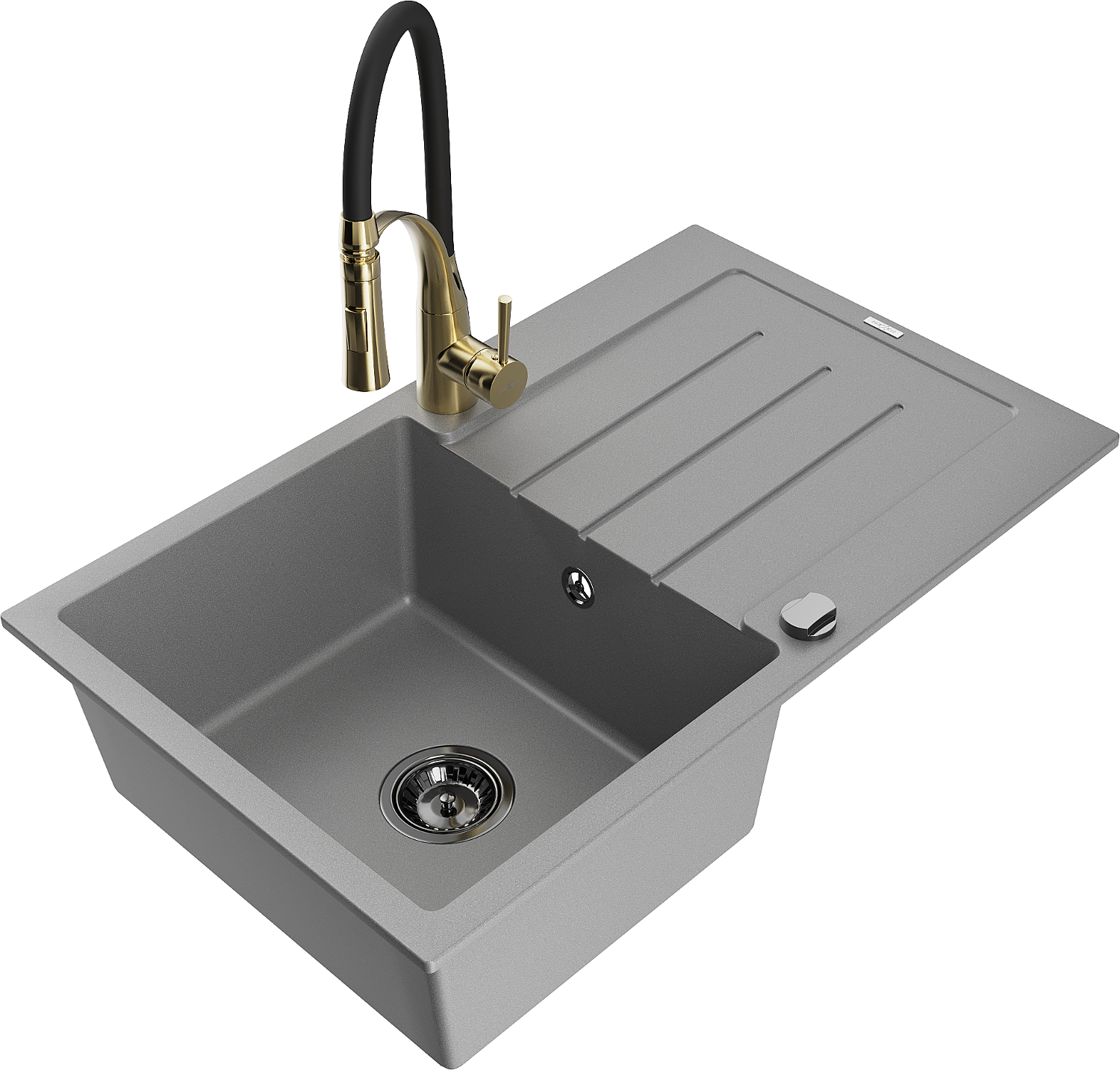 Mexen Bruno lava-louça de granito com 1 cuba com escorredor e torneira de cozinha Aster, cinza - 6513-71-73450-57-B