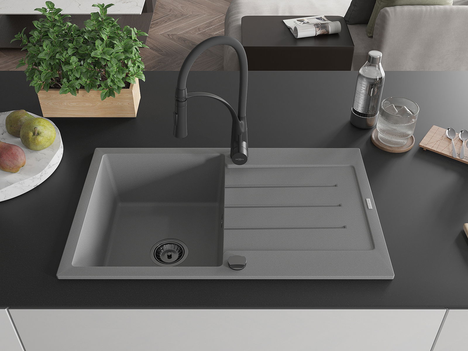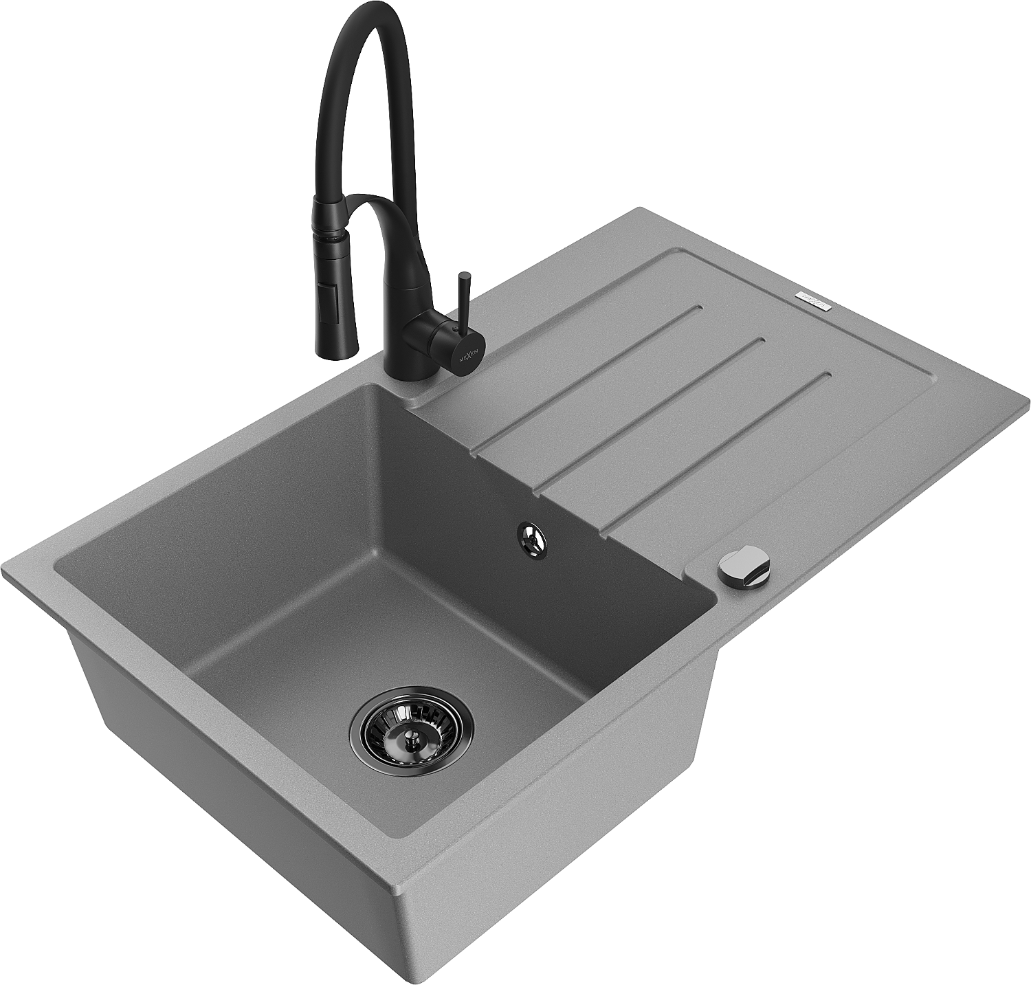 Mexen Bruno lava-louça de granito de 1 cuba com escorredor e torneira de cozinha Aster, cinzento - 6513-71-73450-70-B