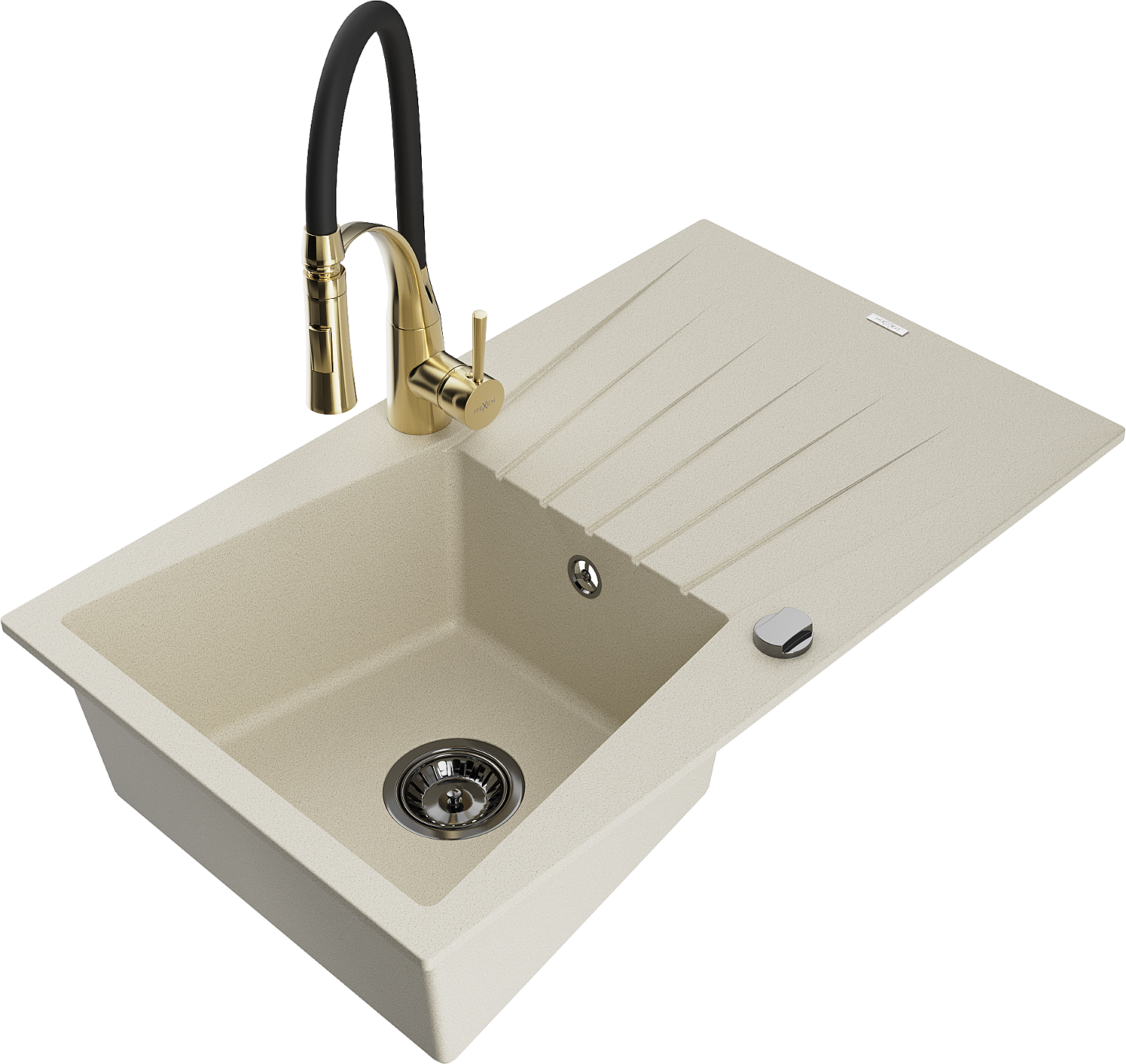 Mexen Cesar lava-louça de granito de 1 câmara com escorredor e torneira de cozinha Aster, bege - 6514-69-73450-57-B