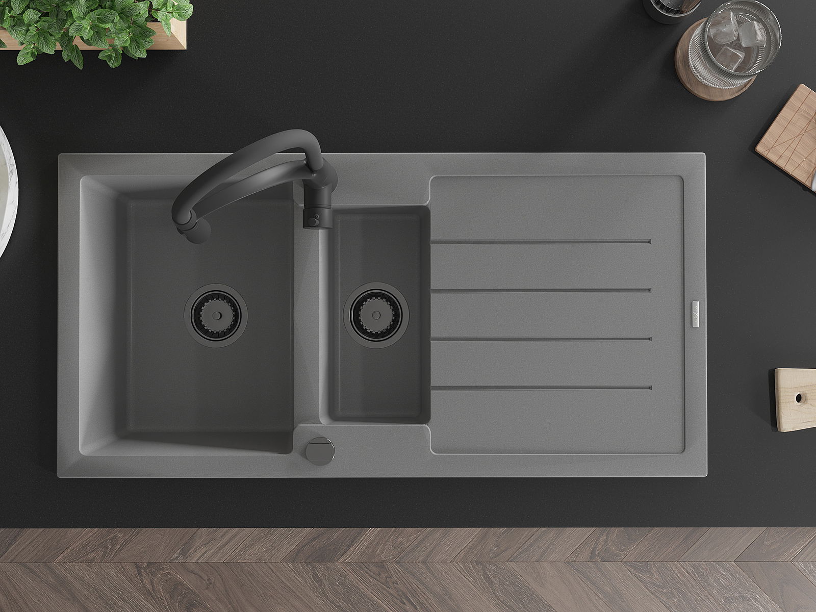 Mexen Andres lava-loiça de granito com 1,5 bacias com escorredor e torneira de cozinha Aster, cinzento - 6515-71-73450-70-B