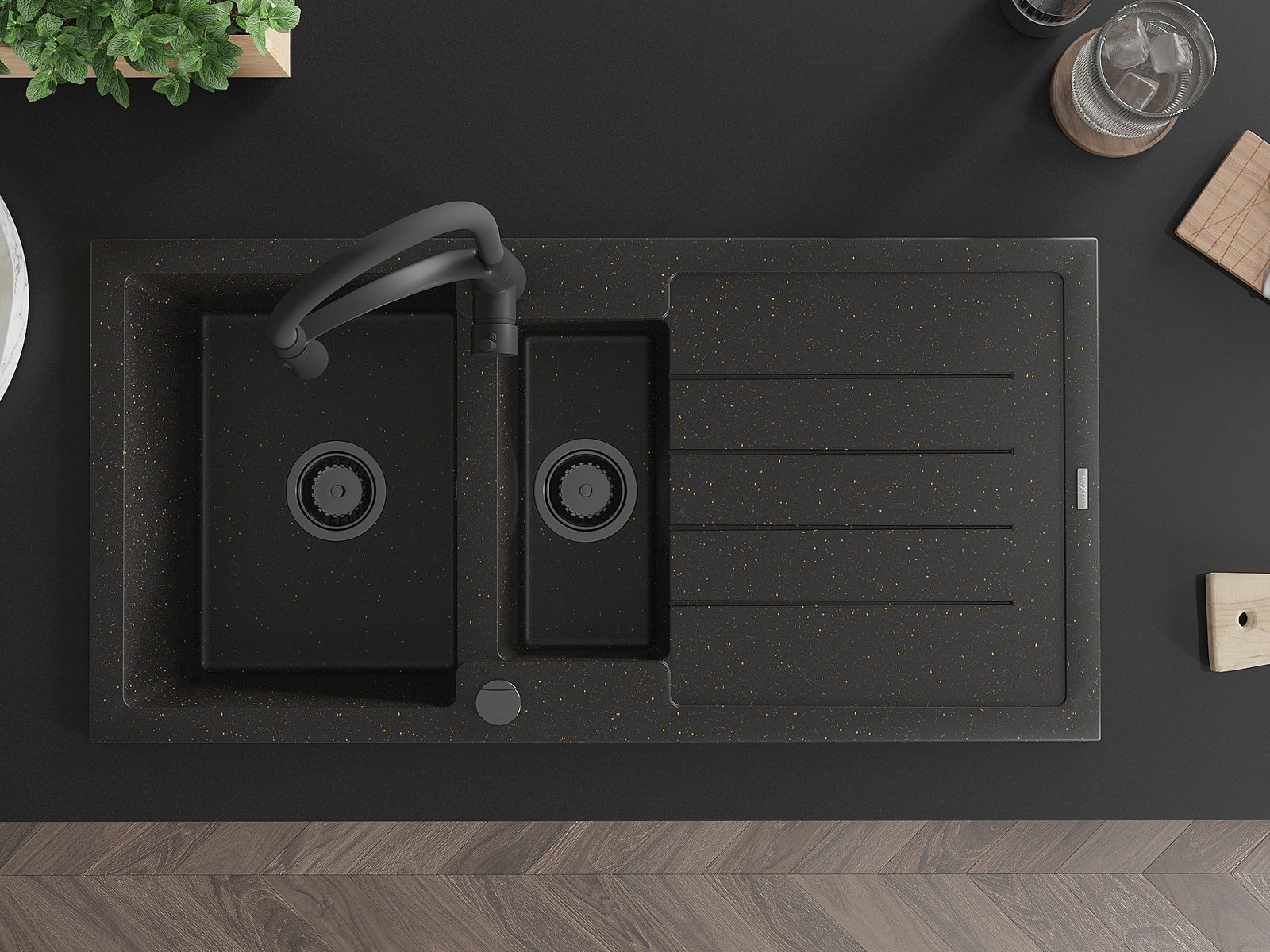 Mexen Andres lava-loiça de granito com 1,5 bacias, escorredor e torneira de cozinha Aster, preto/dourado metálico