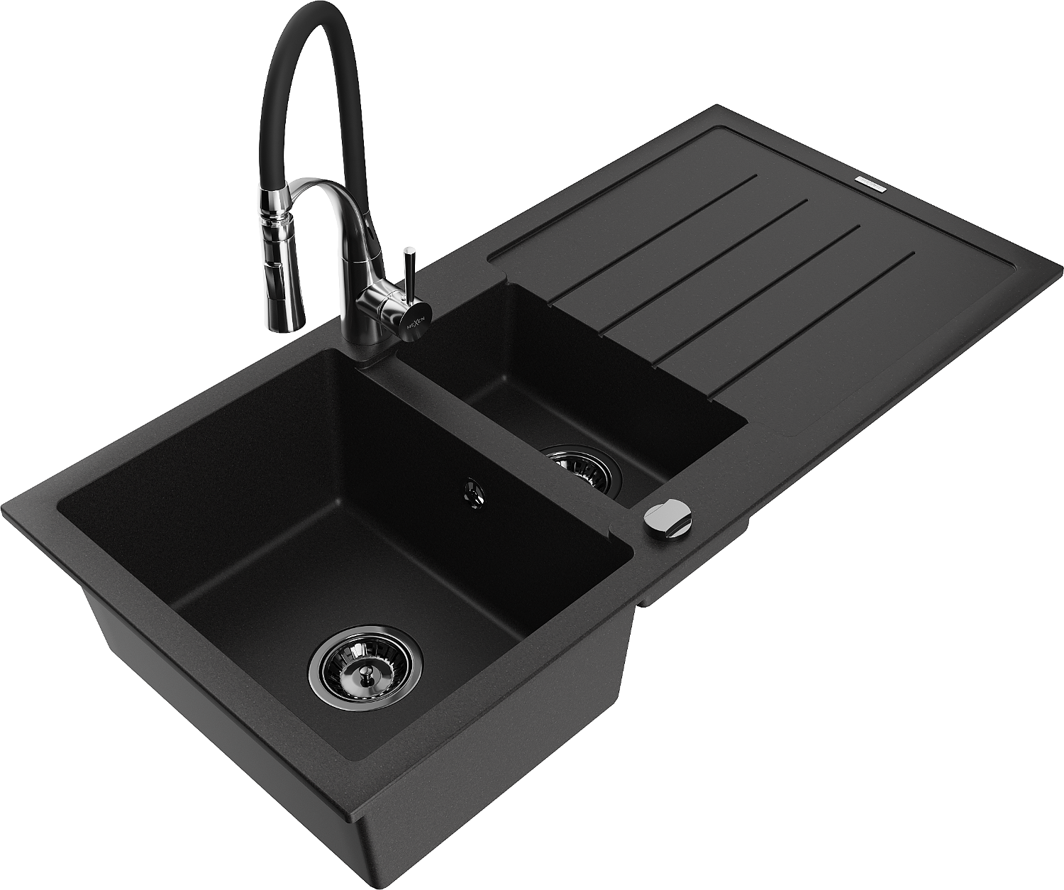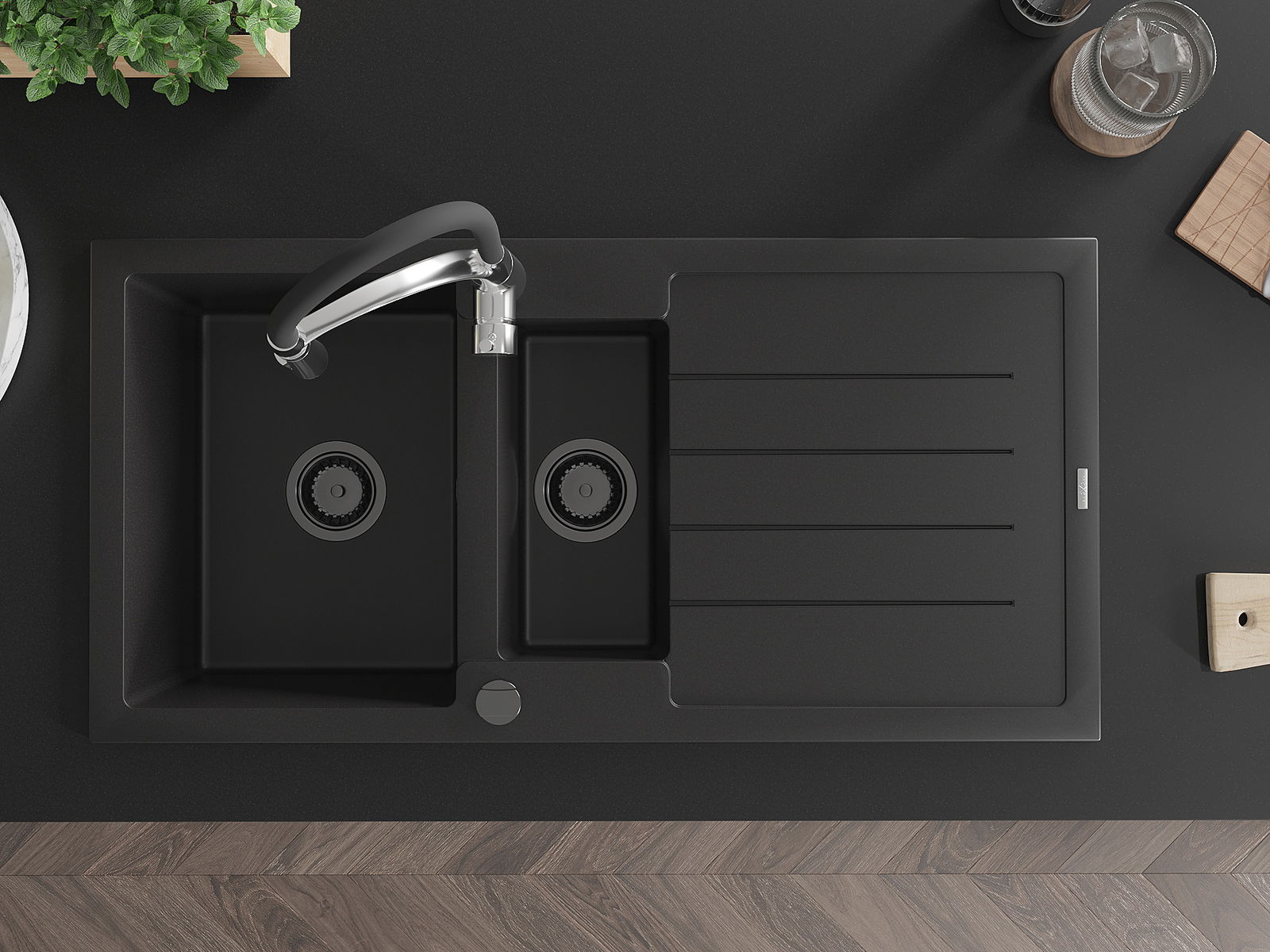 Mexen Andres lava-louça em granito com 1,5 bacias com escorredor e torneira de cozinha Aster, preto - 6515-77-73450-07-B