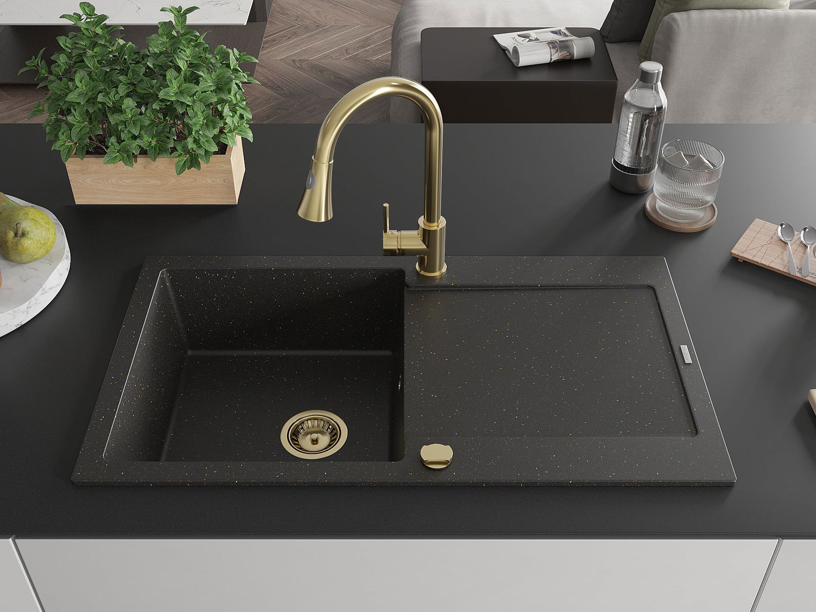 Mexen Leo lava-loiça de granito de 1 bacia com escorredor e torneira de cozinha Elia, preto/dourado metálico