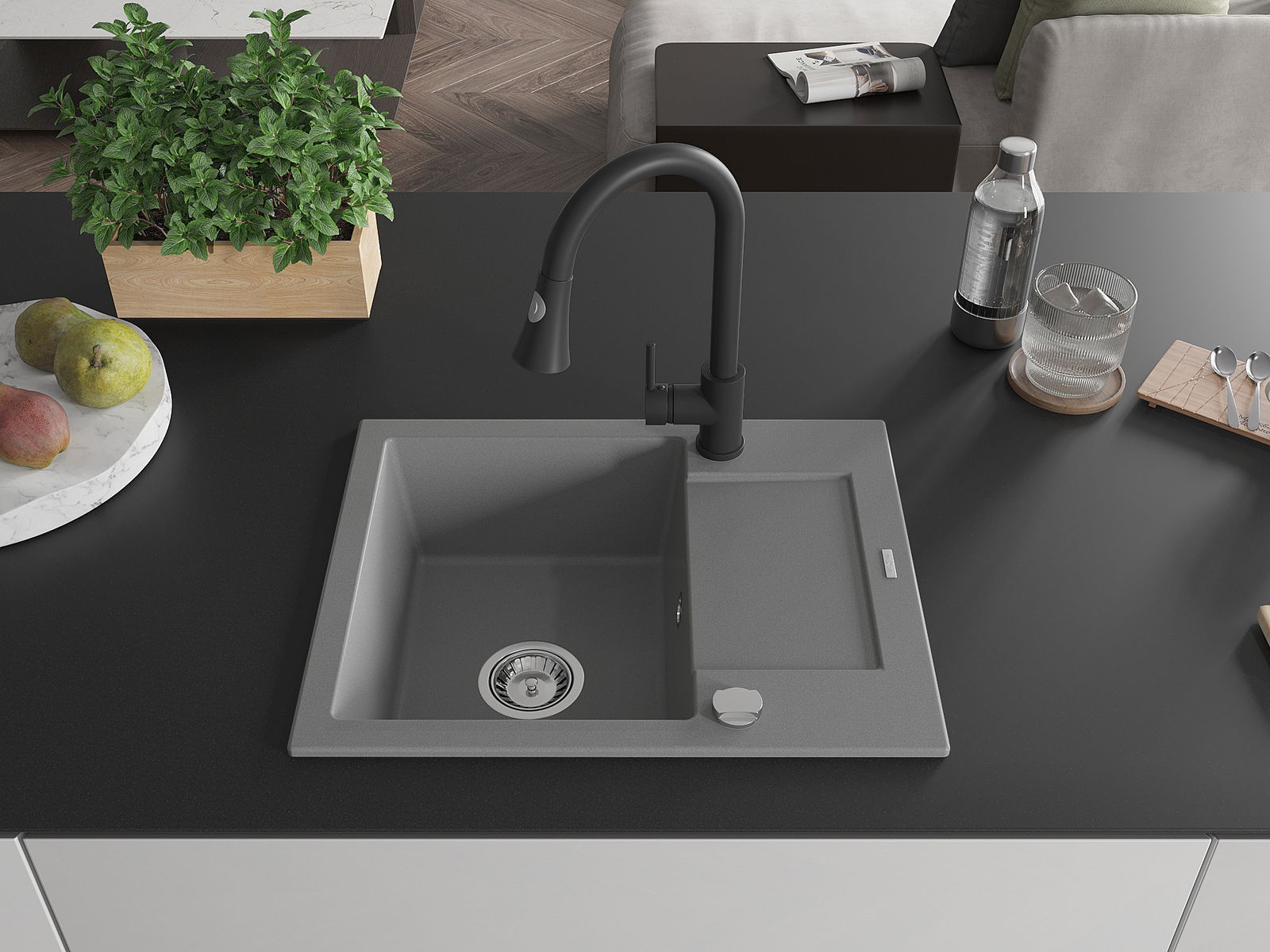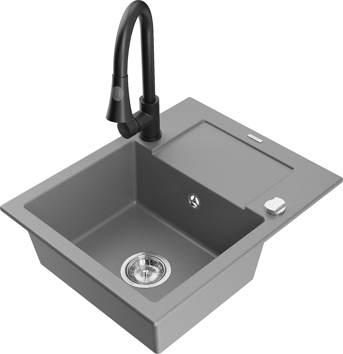 Mexen Enzo lava-loiça de granito com 1 cuba com escorredor e torneira de cozinha Elia, cinzento - 6506-71-670101-70