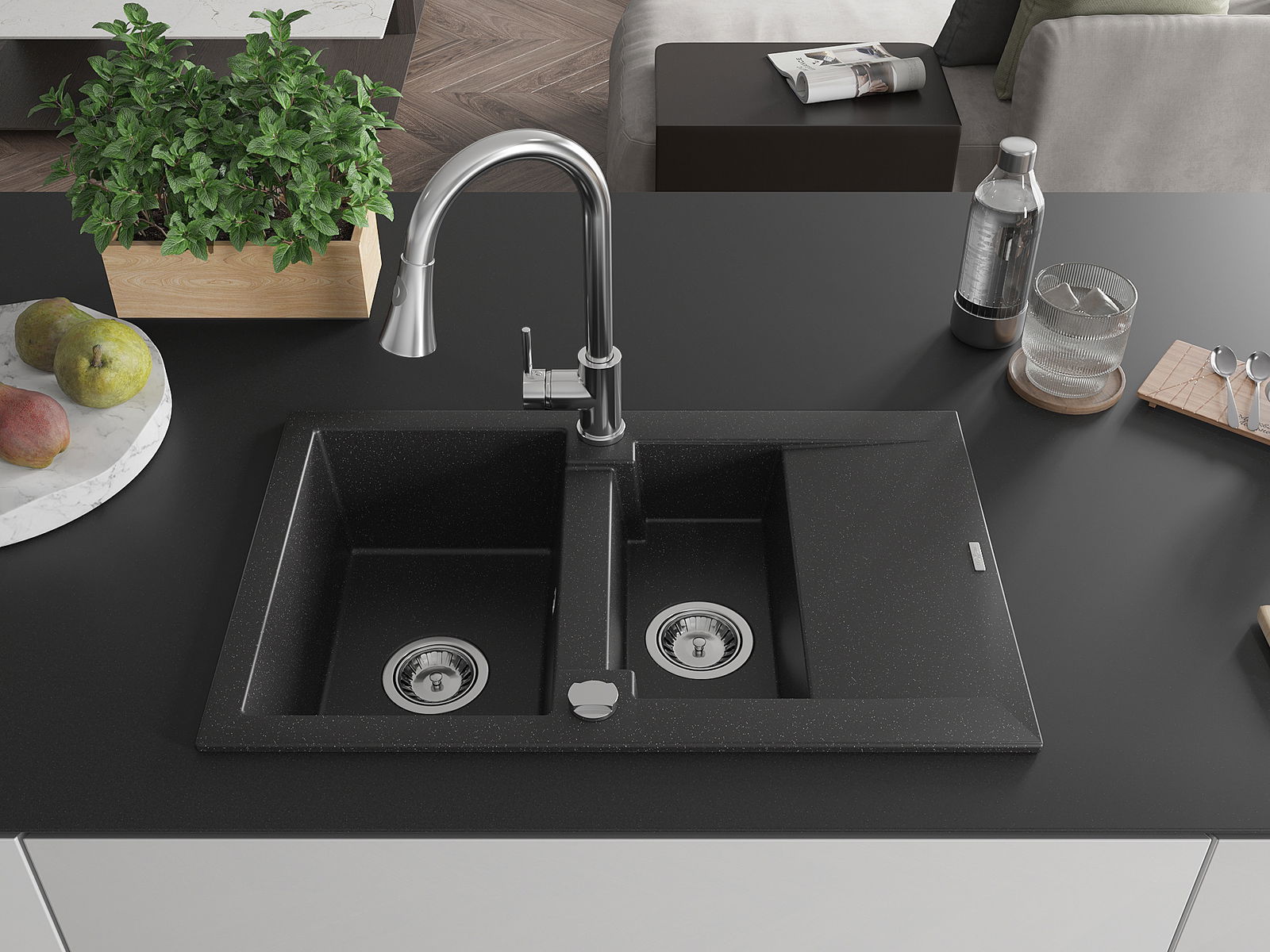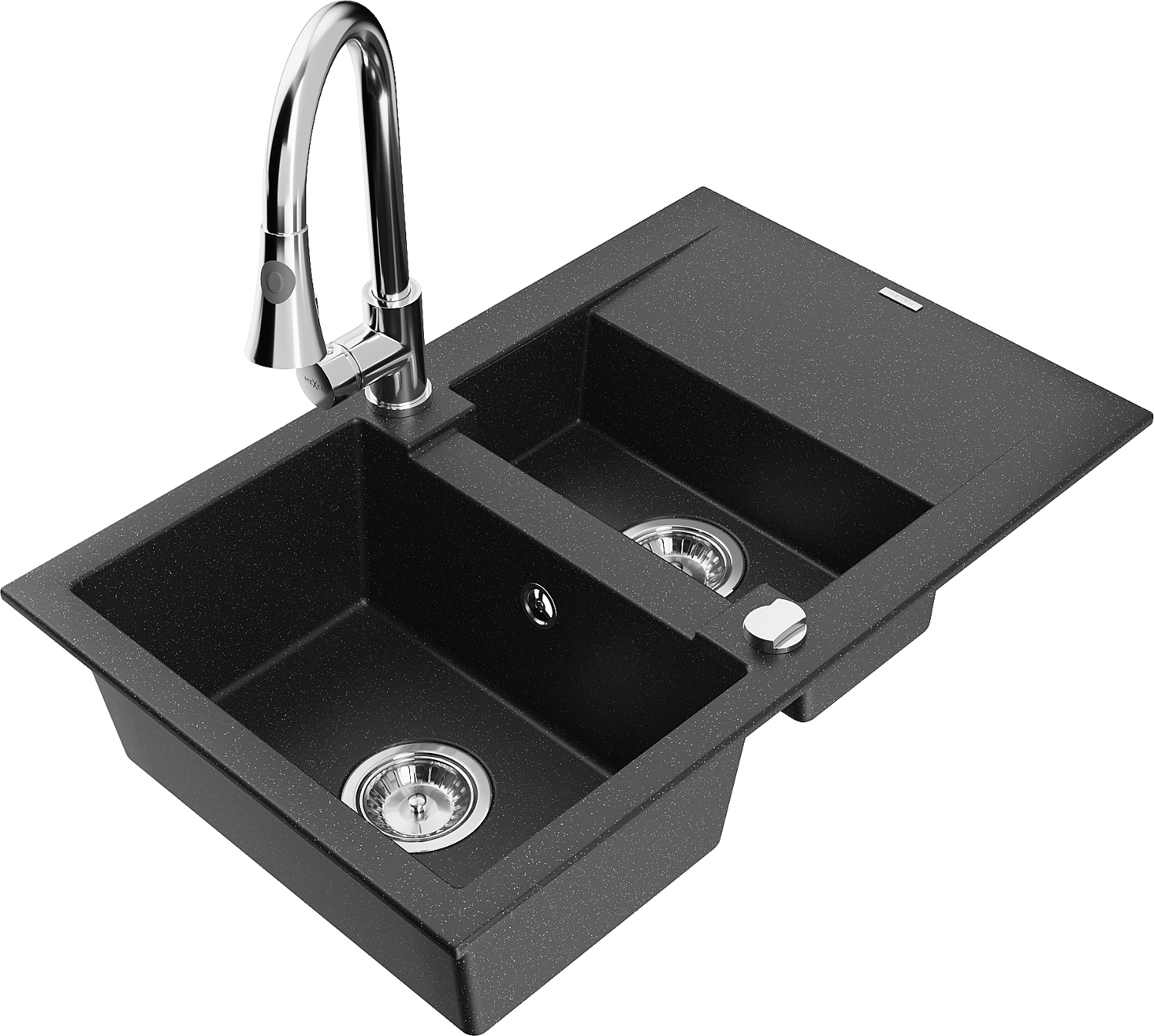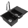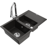Mexen Gaspar lava-louça de granito com 1,5 bacias, escorredor e torneira de cozinha Elia, preto/metálico prateado