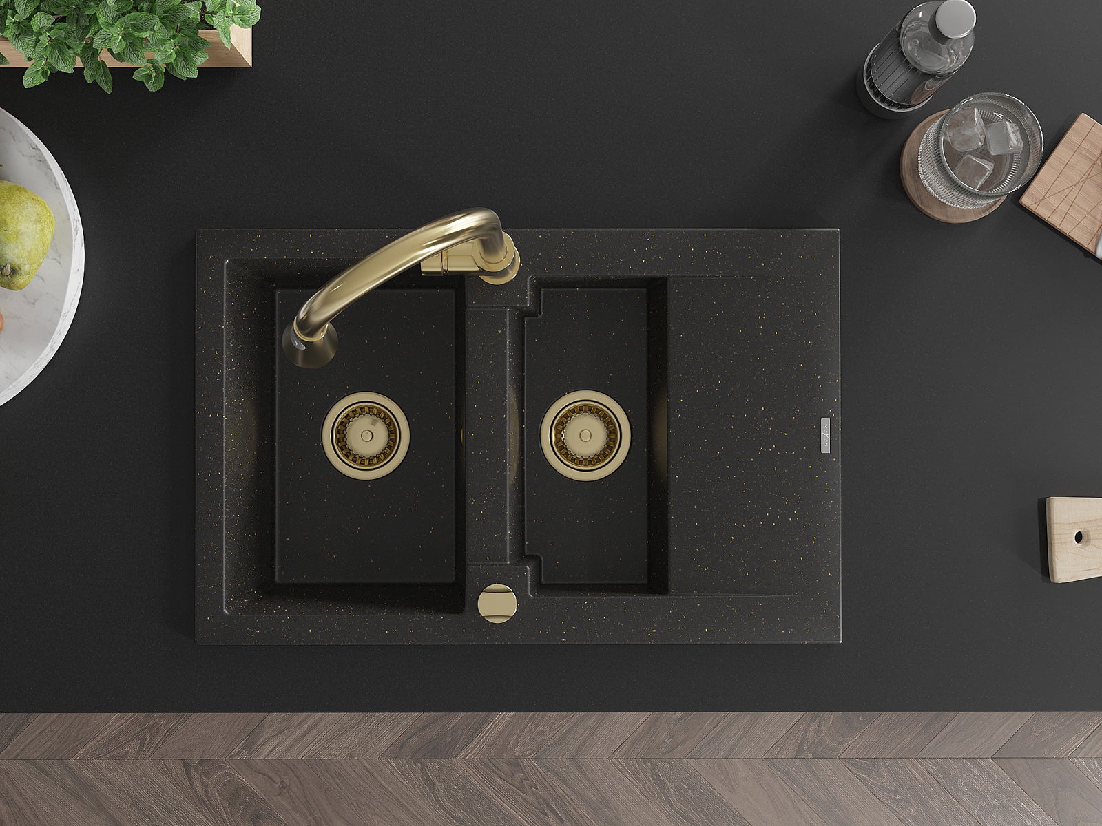 Mexen Gaspar lava-louça em granito 1,5-com água com escorredor e torneira de cozinha Elia, preto/dourado metálico