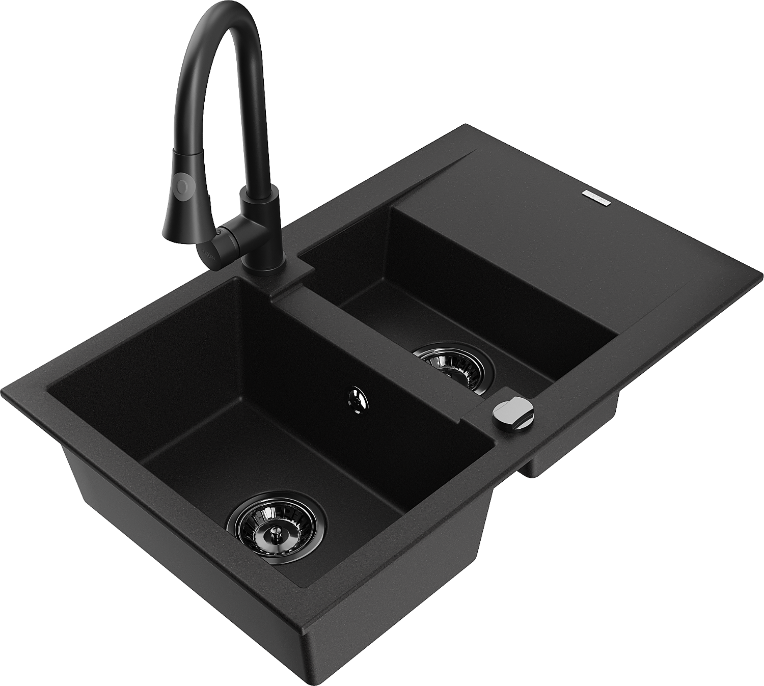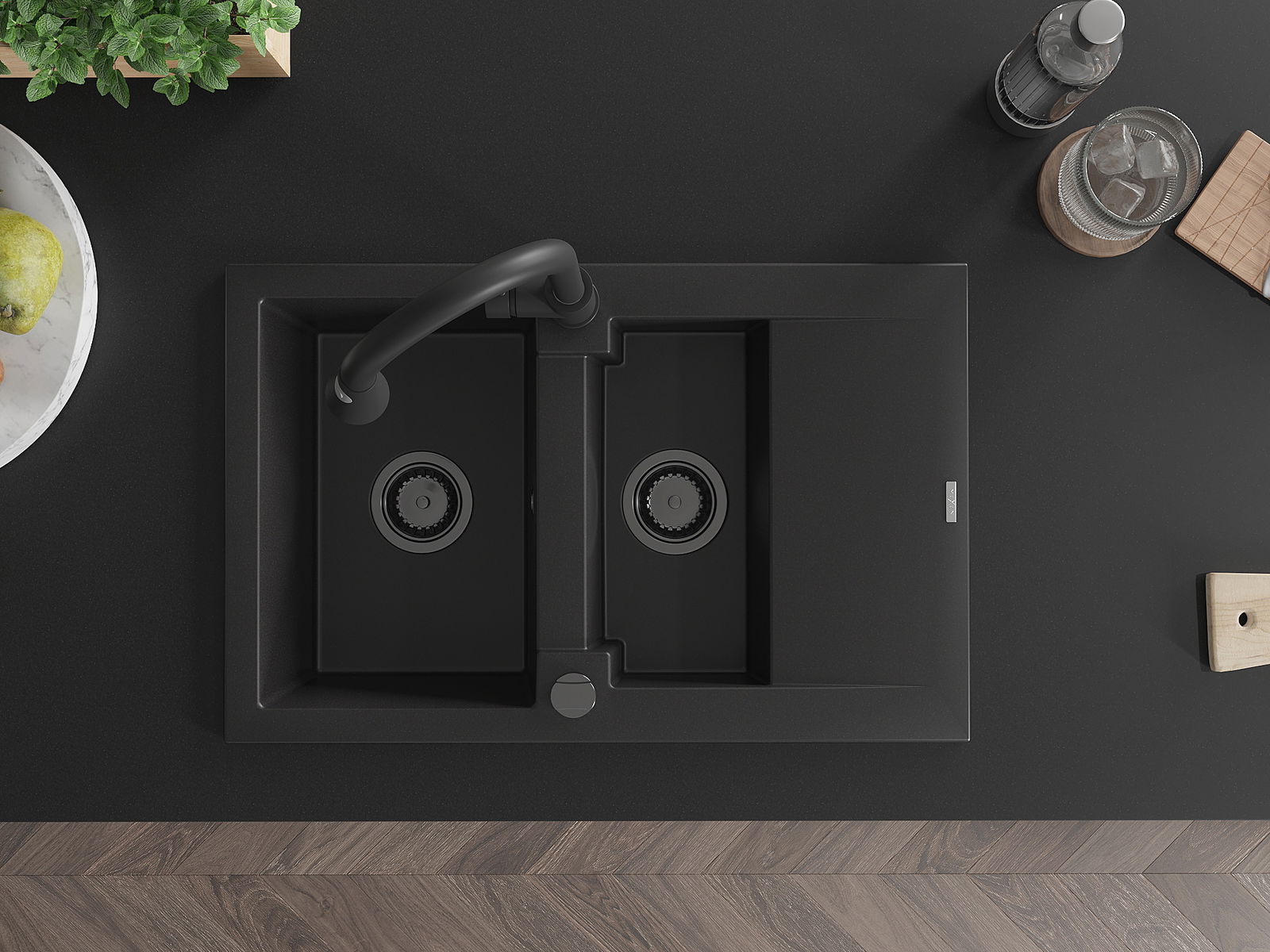 Mexen Gaspar lava-loiças de granito 1,5-com cubas com escorredor e torneira de cozinha Elia, preto - 6507-77-670101-70-B