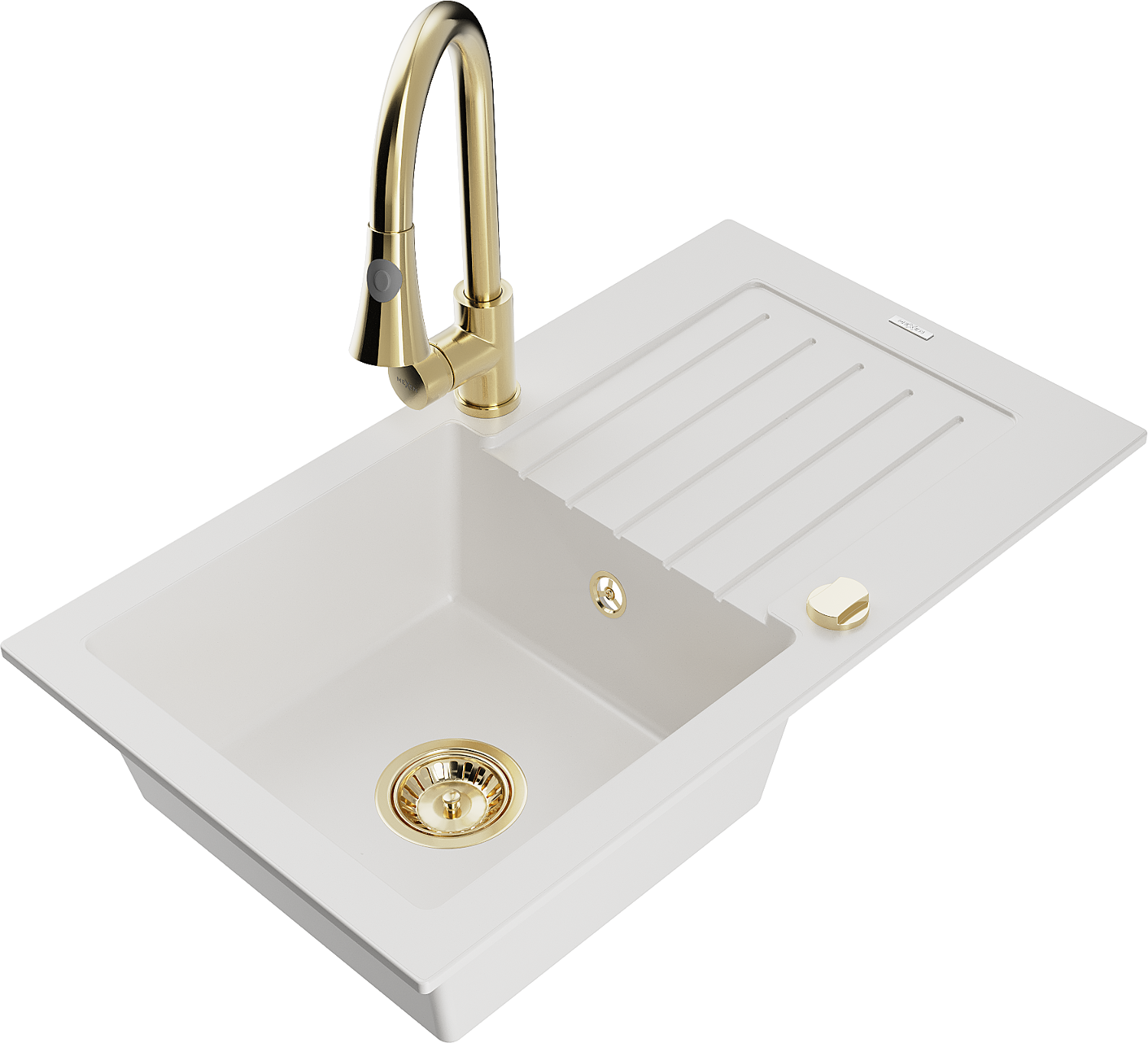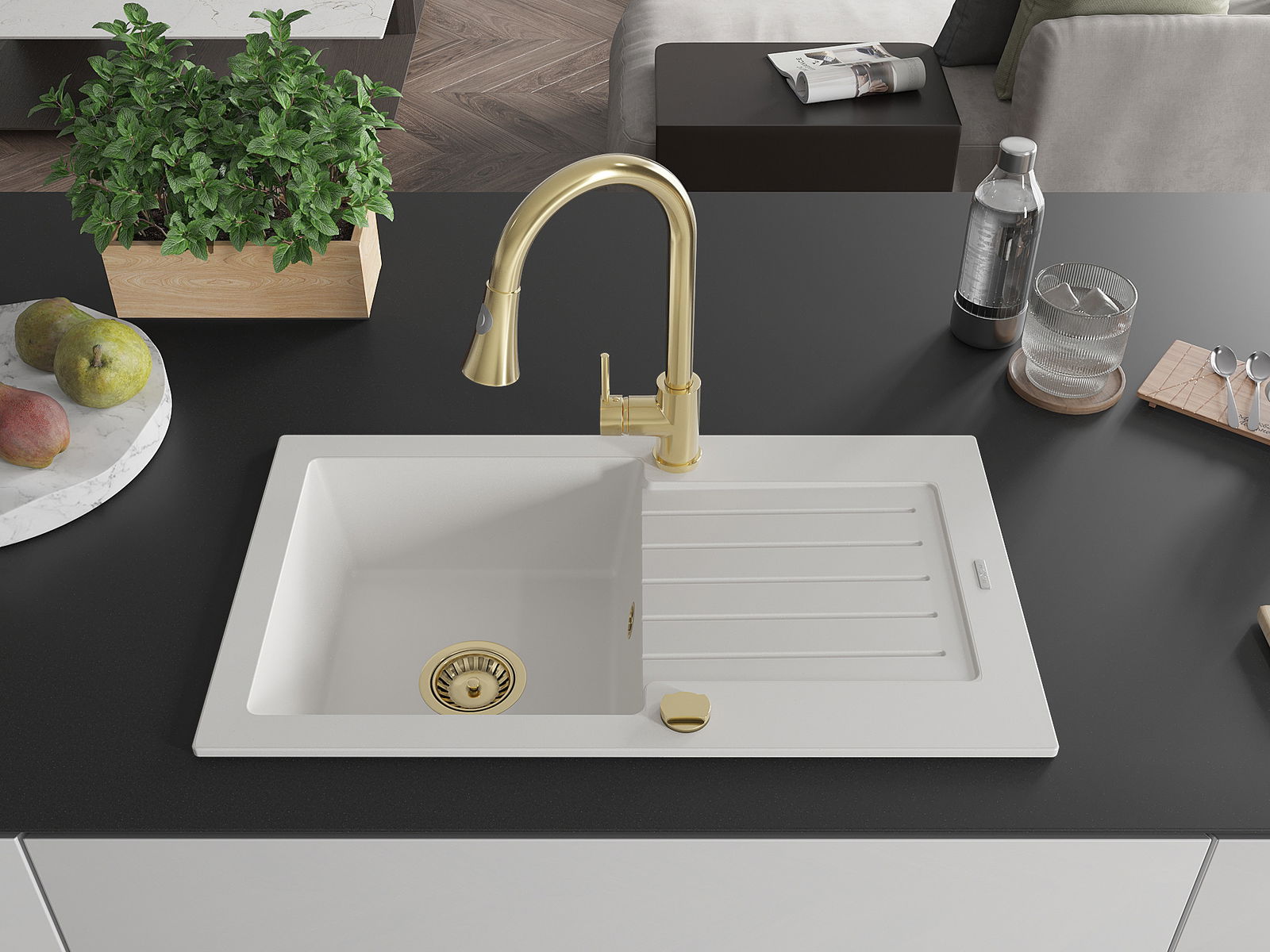 Mexen Pablo lava-louça de granito de uma cuba com escorredor e torneira de cozinha Elia, branco - 6510-20-670101-50