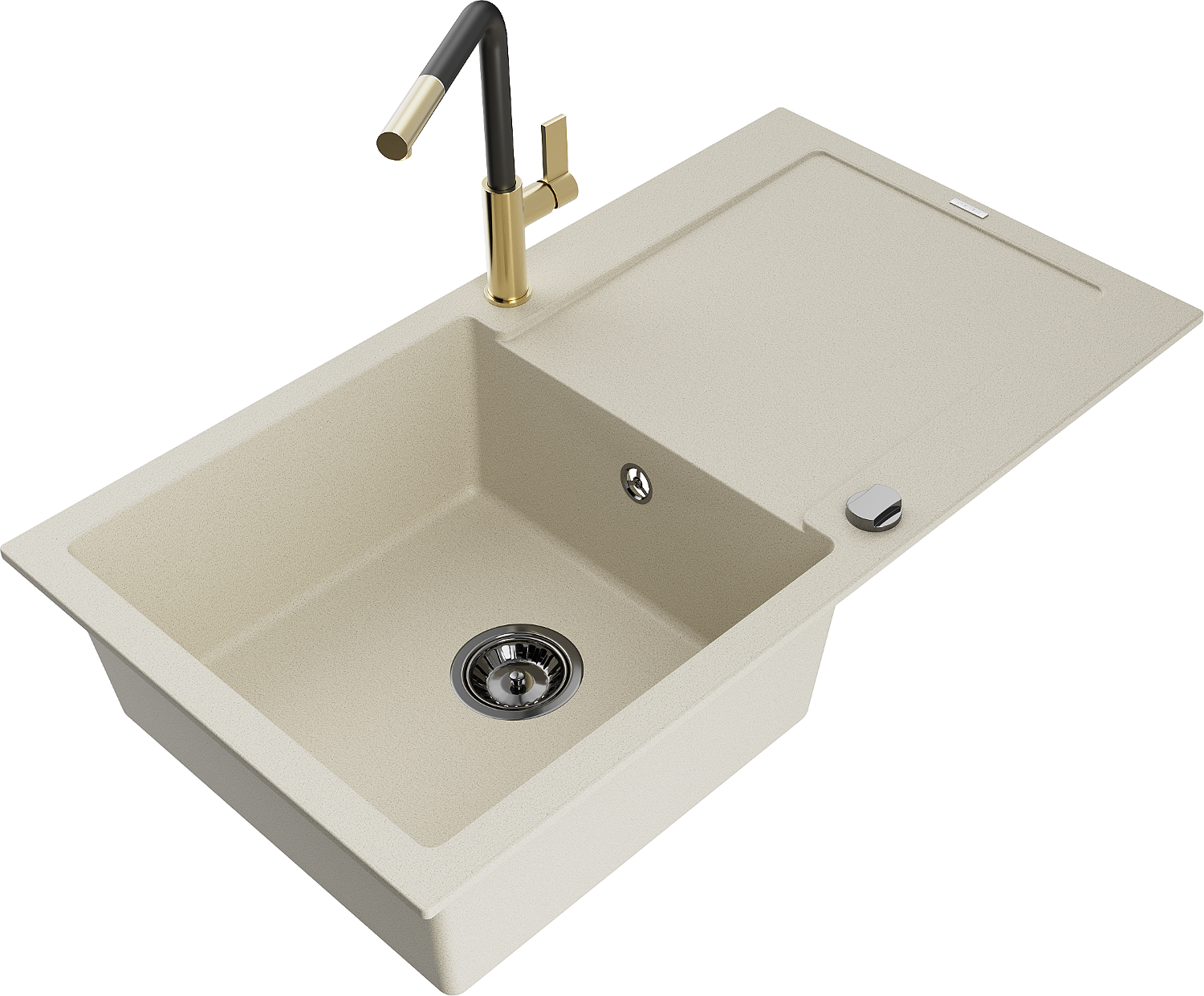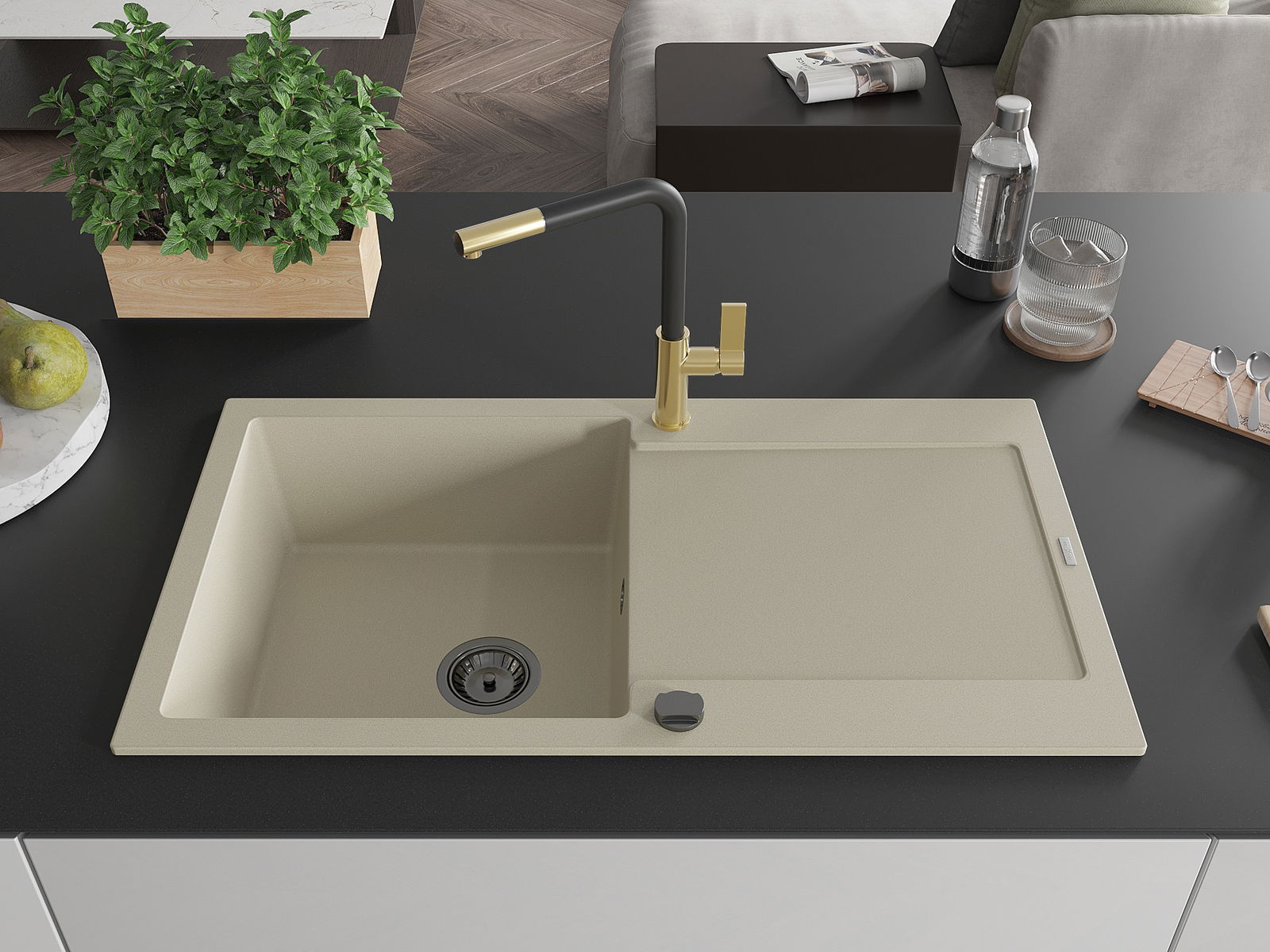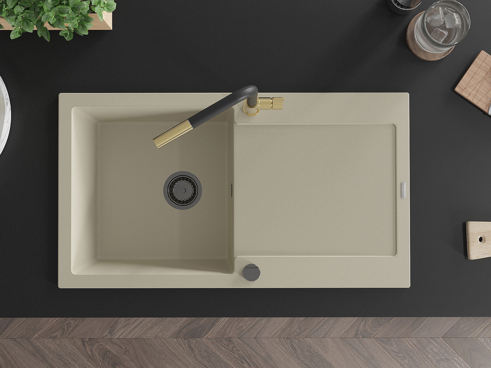 Mexen Leo lava-louça de granito 1-cuba com escorredor e misturadora de cozinha Flora, bege - 6501-69-670401-57-B