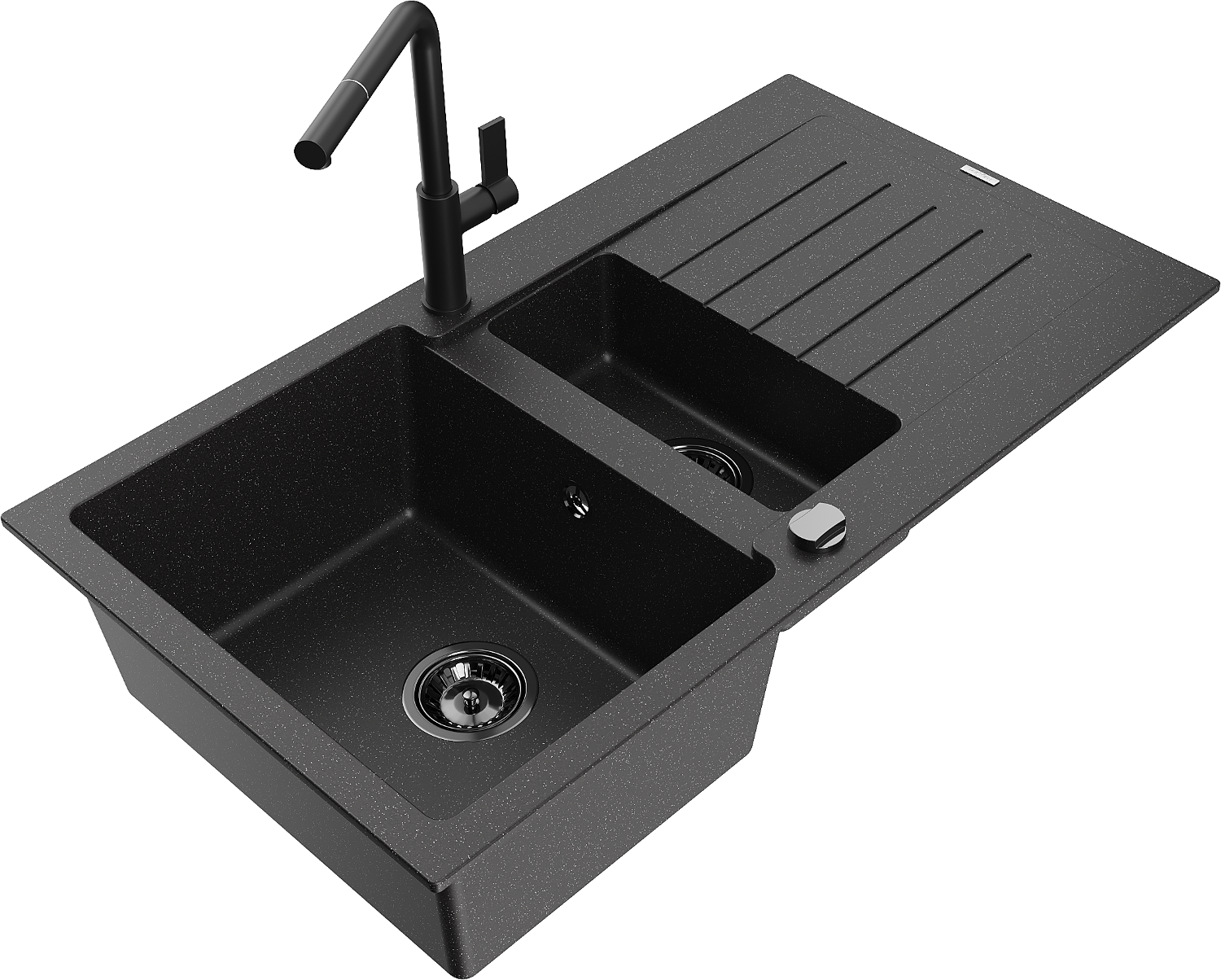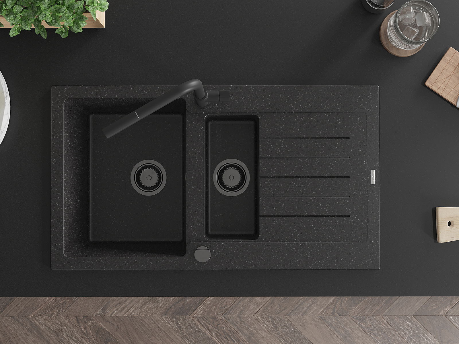 Mexen Matias lava-louça em granito com 1,5 cubas, escorredor e torneira de cozinha Flora, preto/prateado - 6502-73-670401-70-B