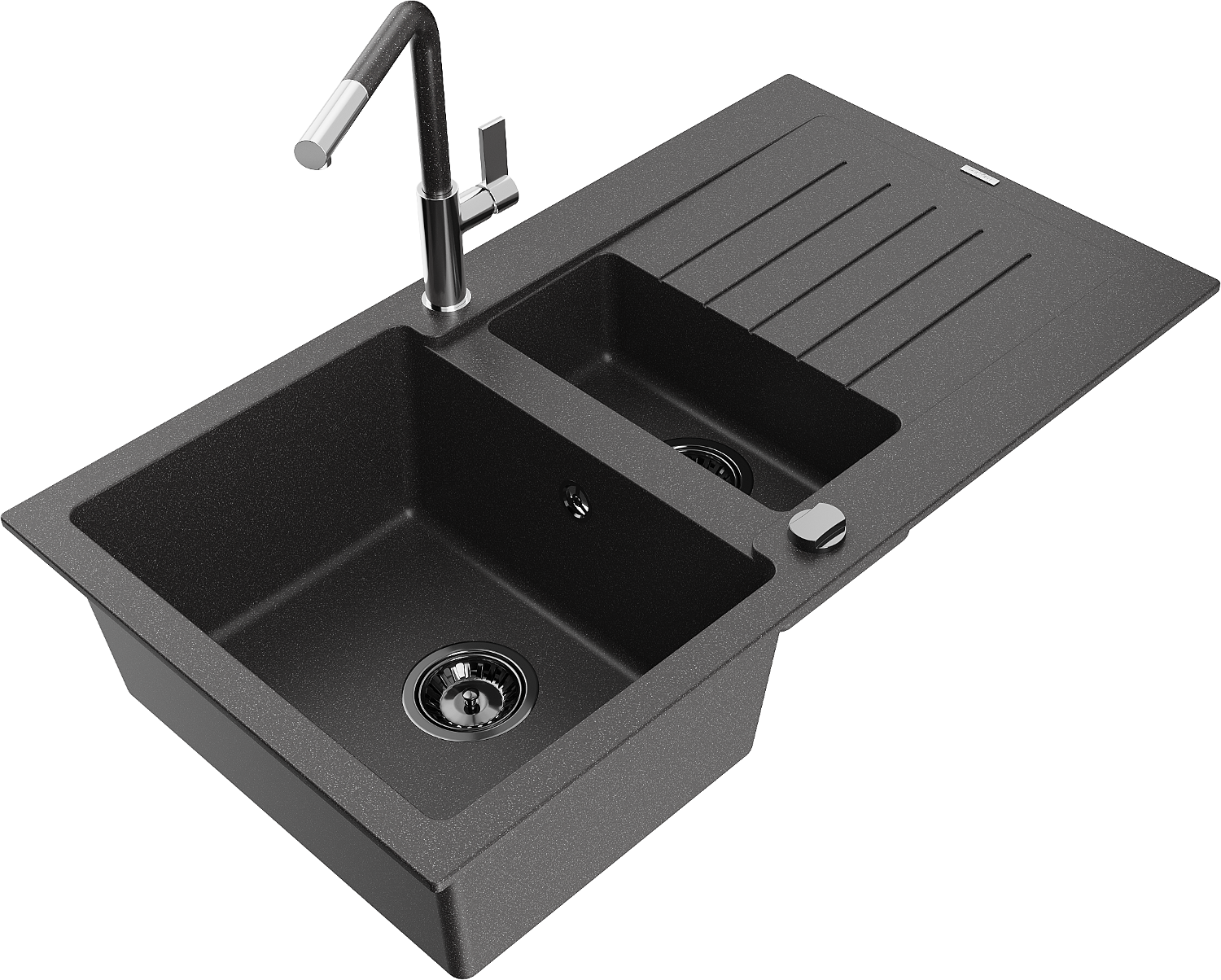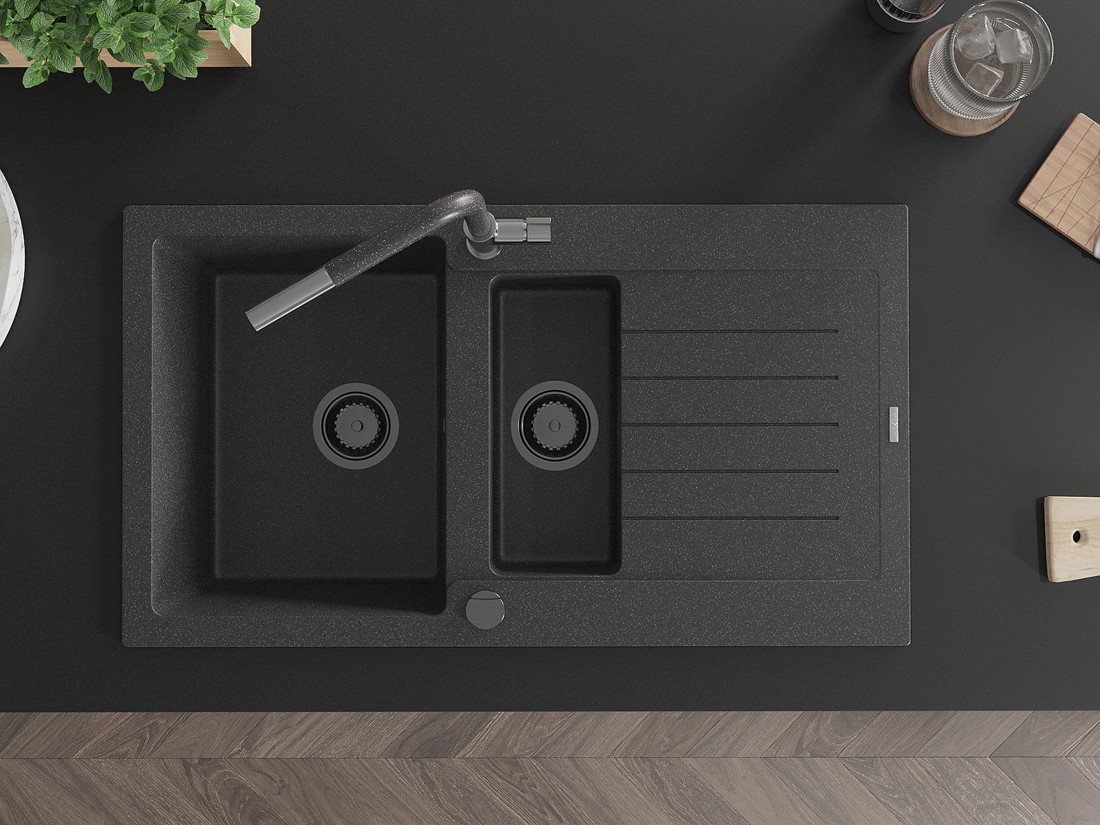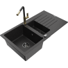Mexen Matias lava-loiça de granito com 1,5 bacias e escorredor e torneira de cozinha Flora, preto salpicado