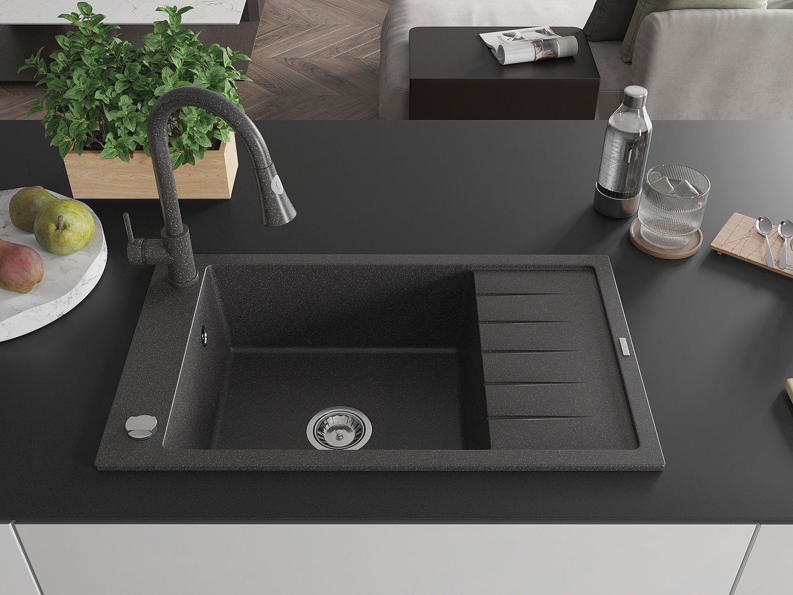 O lava-loiça é feito de granito de alta qualidade. Constitui um complemento elegante, e acima de tudo prático, para qualquer cozinha, independentemente do seu estilo. A alta qualidade e durabilidade do granito garantem muitos anos de utilização.