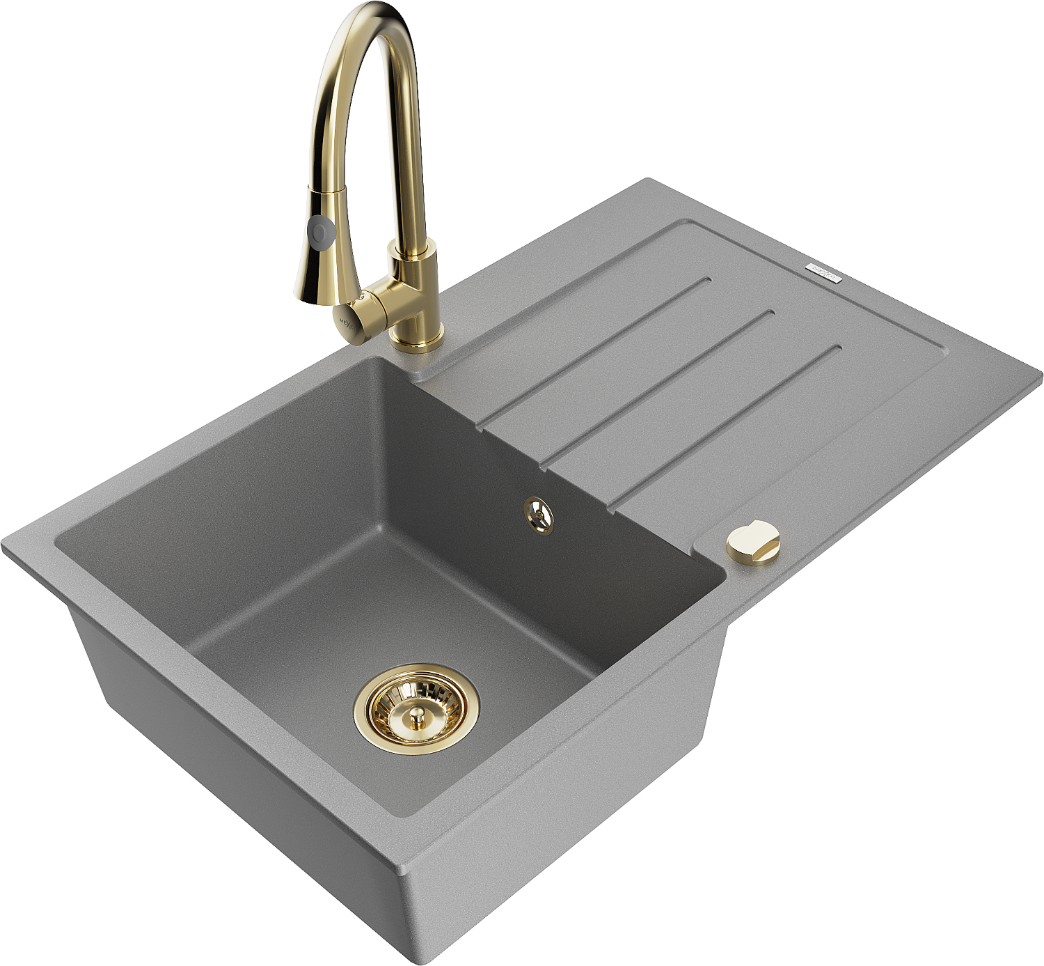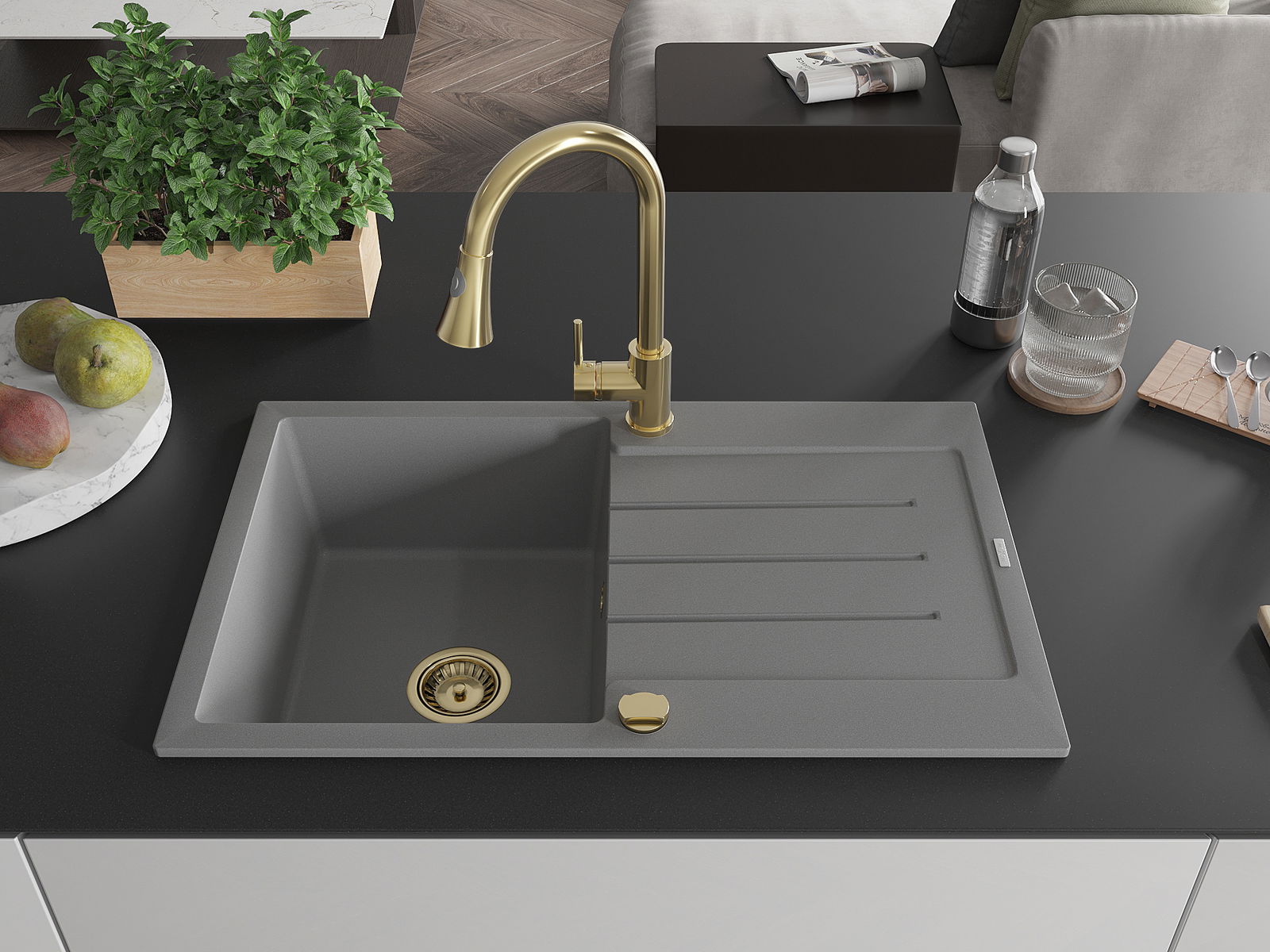 Mexen Bruno lava-loiça de granito 1-cuba com escorredor e torneira de cozinha Elia, cinza - 6513-71-670101-50