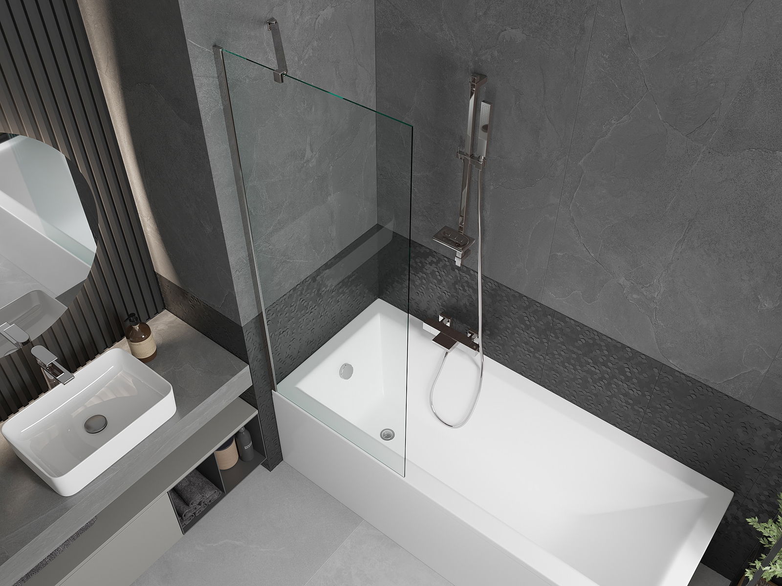 Proteção eficaz contra o derramamento de água durante o banho. O parapeito possui vedações que se ajustam perfeitamente à superfície do vidro e à borda da banheira. Solução funcional que garante segurança e fácil manutenção da limpeza.