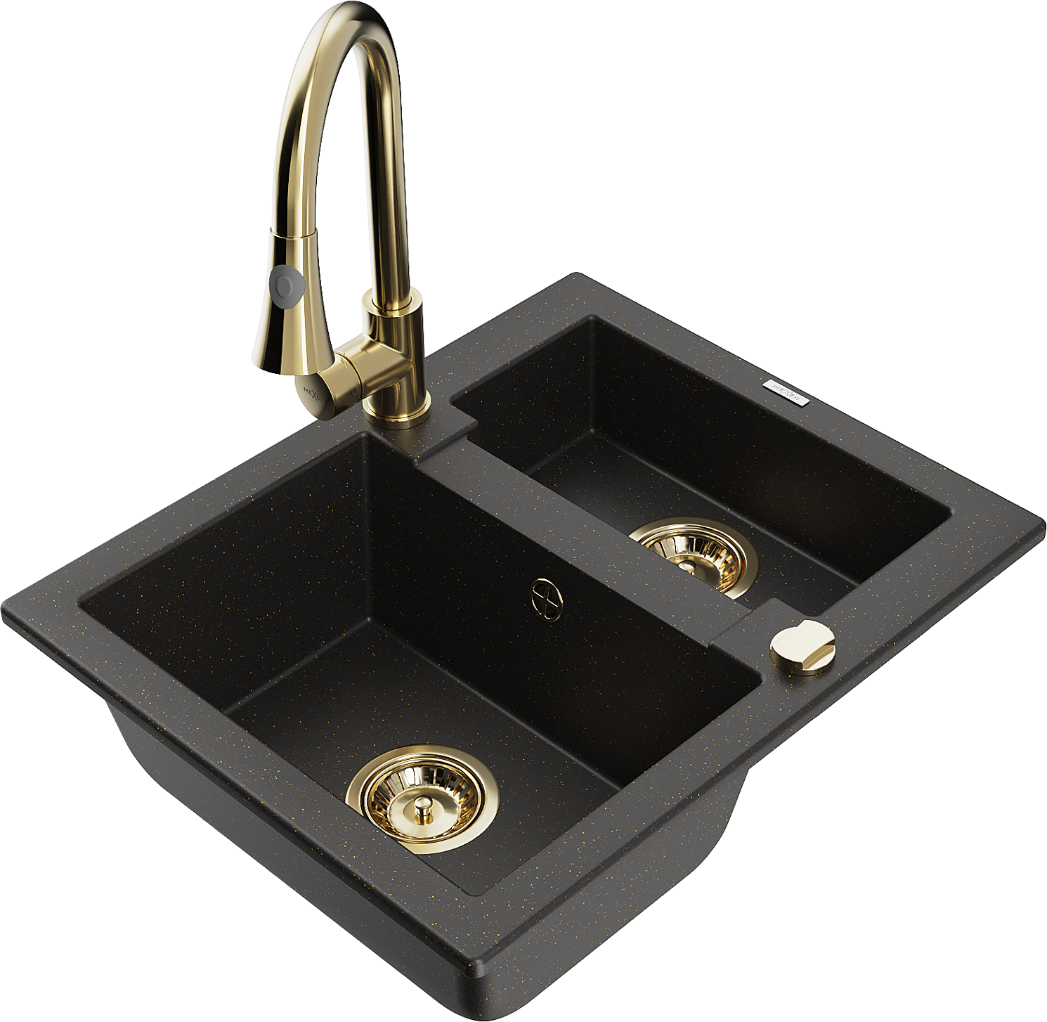 Mexen Carlos lava-loiça de granito de 1,5 cubas com torneira de cozinha Elia, preto/dourado metálico - 6518-75-670101-50