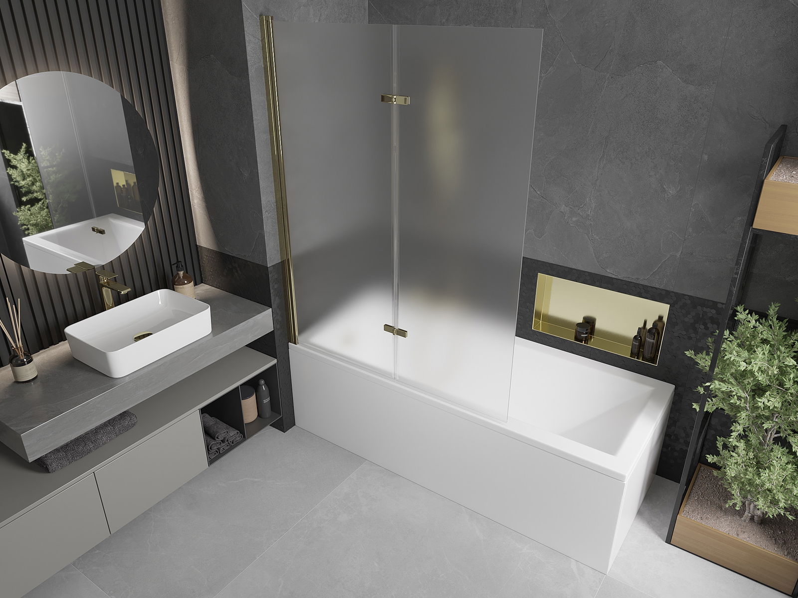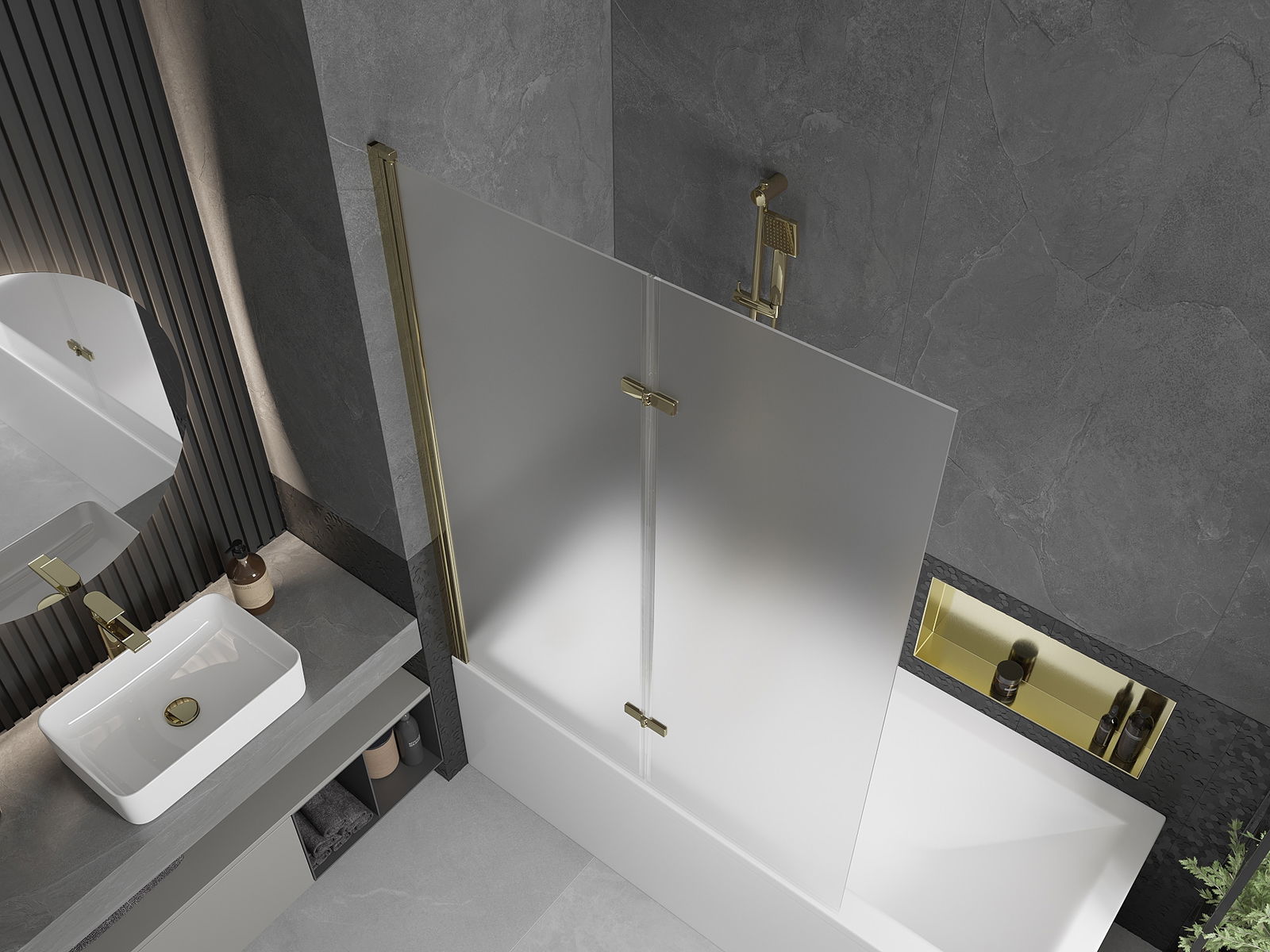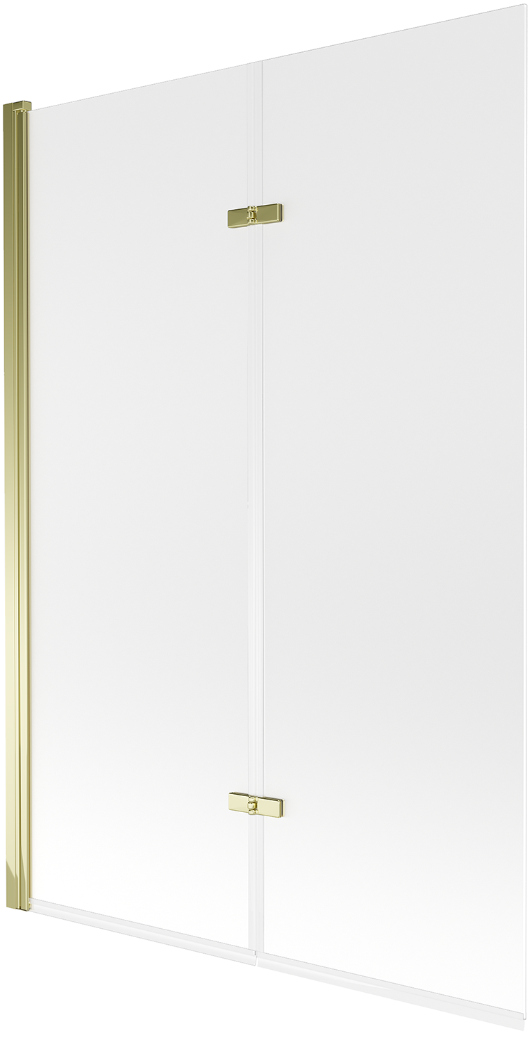 Écrã feito de duas portas com possibilidade de dobrar. Esta solução permite economizar mais espaço na casa de banho e permite o uso livre do espaço restante quando não estamos a usar a área de banho.