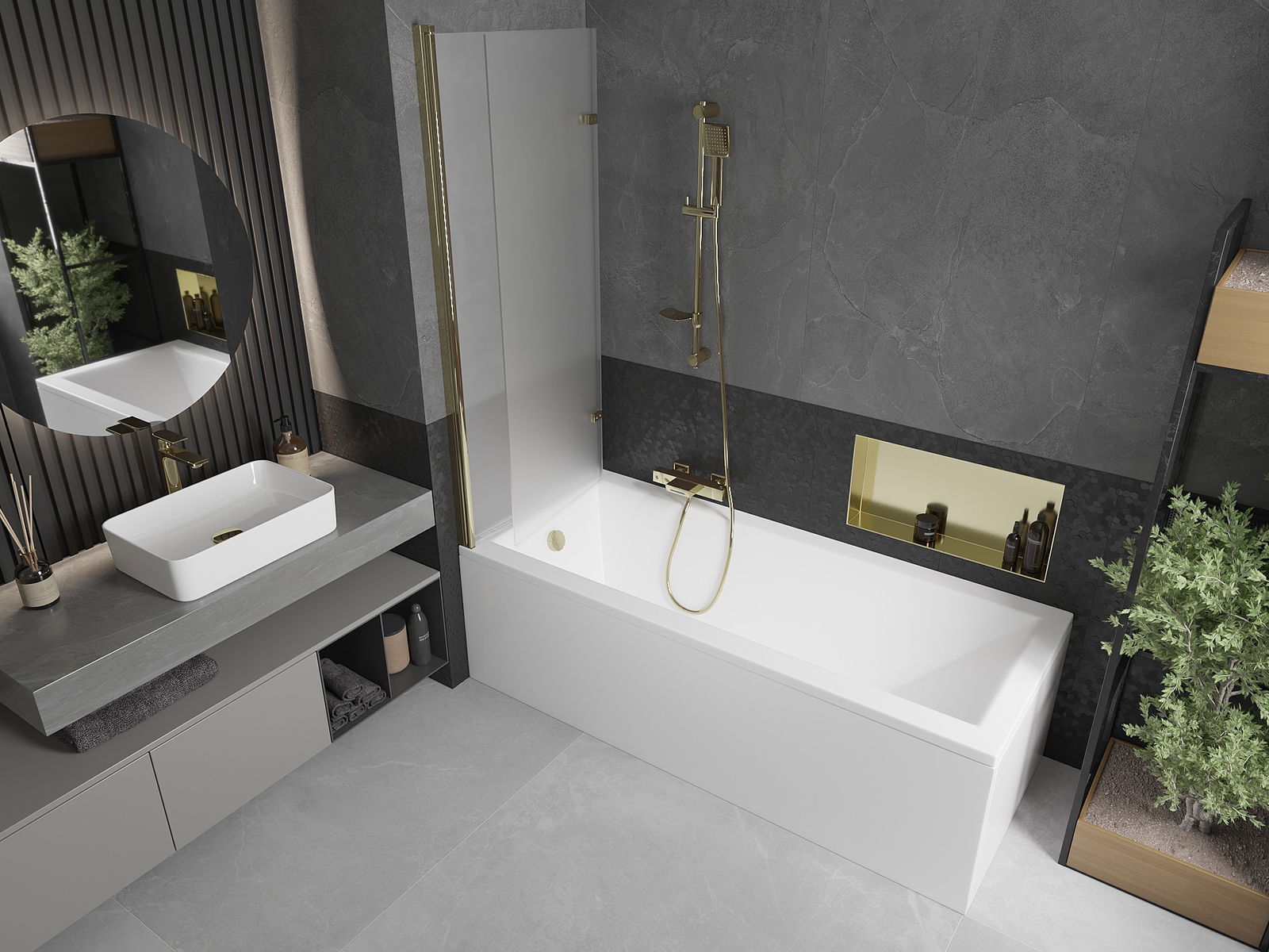 Proteção eficaz contra o derramamento de água durante o banho. O parapeito possui vedações que se ajustam perfeitamente à superfície do vidro e à borda da banheira. Solução funcional que garante segurança e fácil manutenção da limpeza.