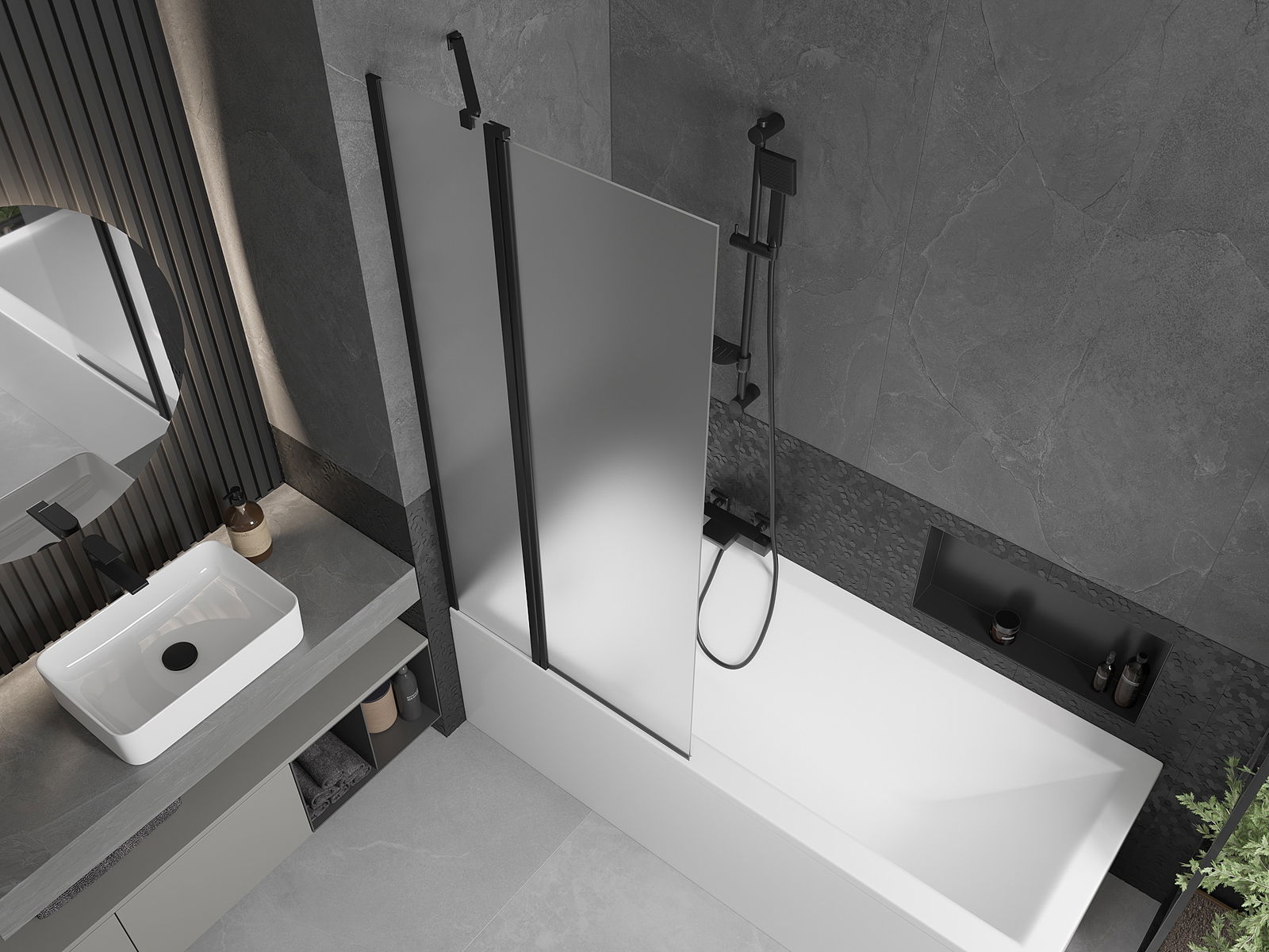 O separador possui uma folha móvel com possibilidade de dobragem. Esta solução permite poupar mais espaço na casa de banho e possibilita a utilização livre do espaço restante quando não estamos a utilizar a zona de banho.