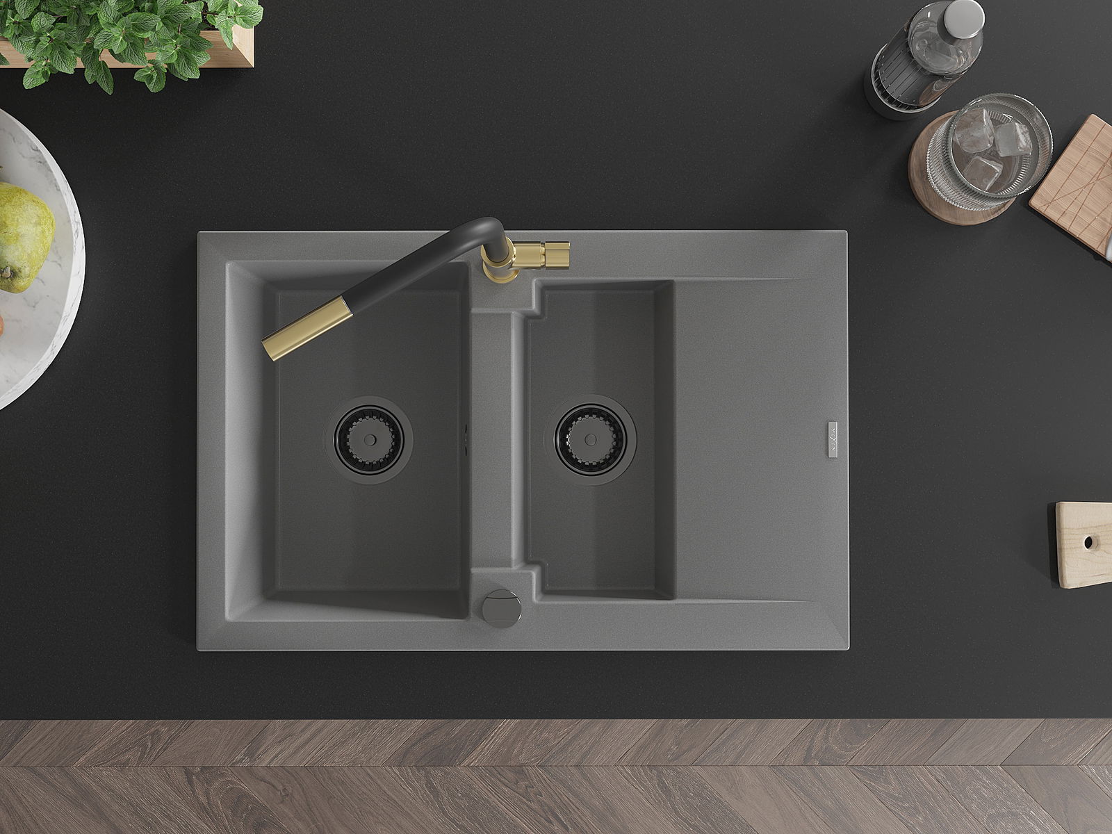 Mexen Gaspar lava-loiça de granito 1,5 câmara com escorredor e torneira de cozinha Flora, cinzento - 6507-71-670401-57-B