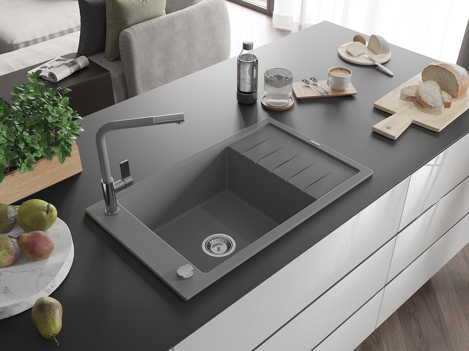 Mexen Elias lava-louça de granito de 1 cuba com escorredor e torneira de cozinha Flora, cinzento - 6511-71-670401-06