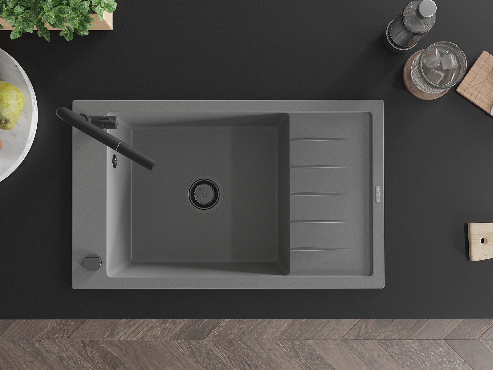 Mexen Elias lava-louça de granito 1-cubículo com escorredor e torneira de cozinha Flora, cinza - 6511-71-670401-70-B