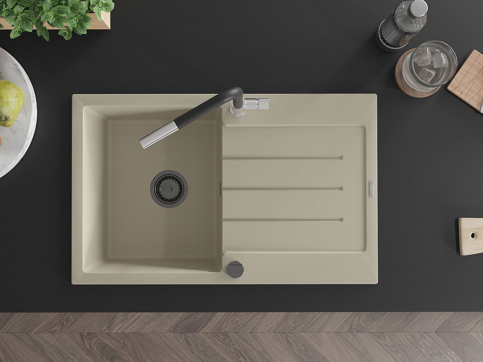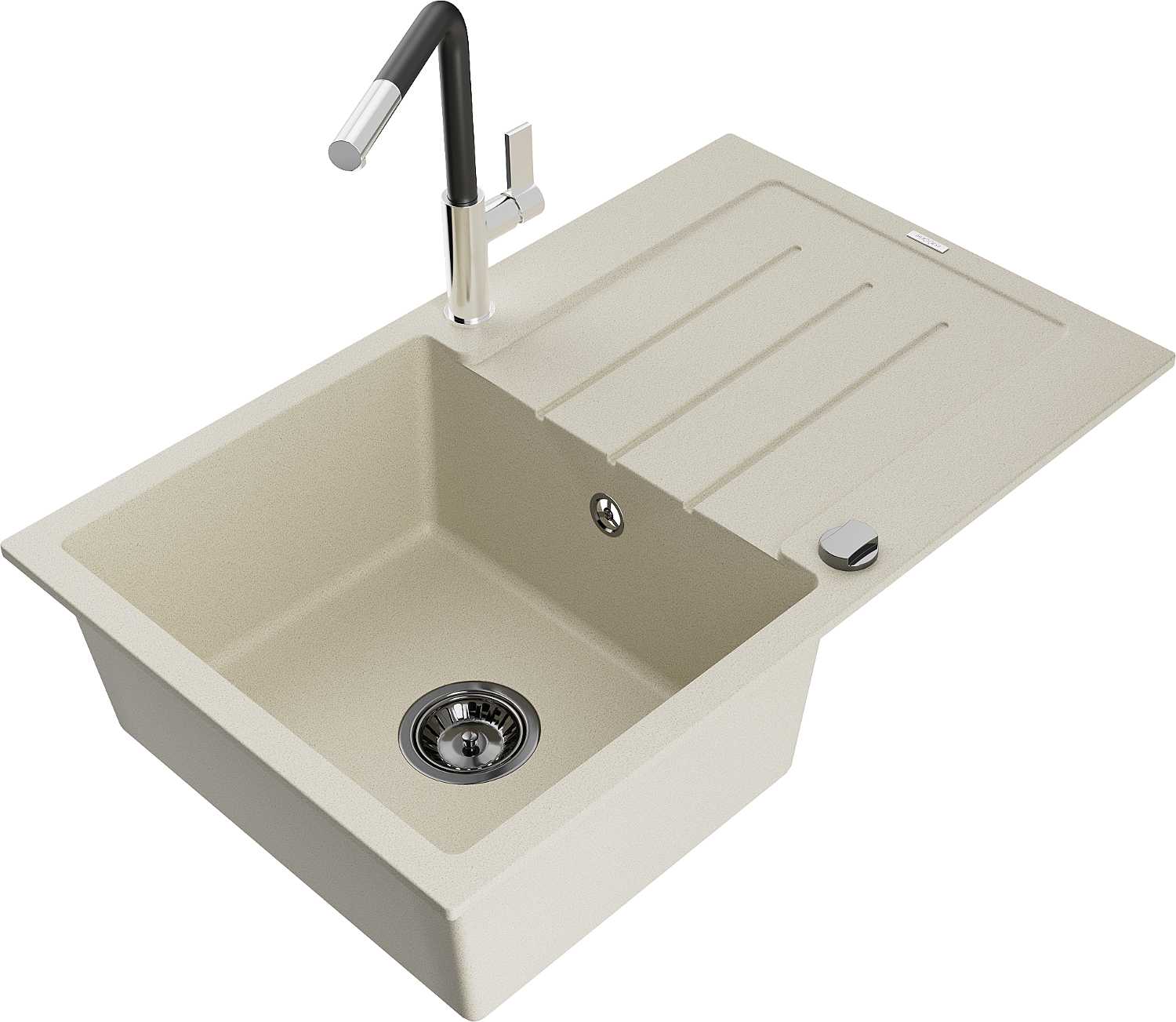 Mexen Bruno lavatório de granito 1-cuba com escorredor e torneira de cozinha Flora, bege - 6513-69-670401-07-B