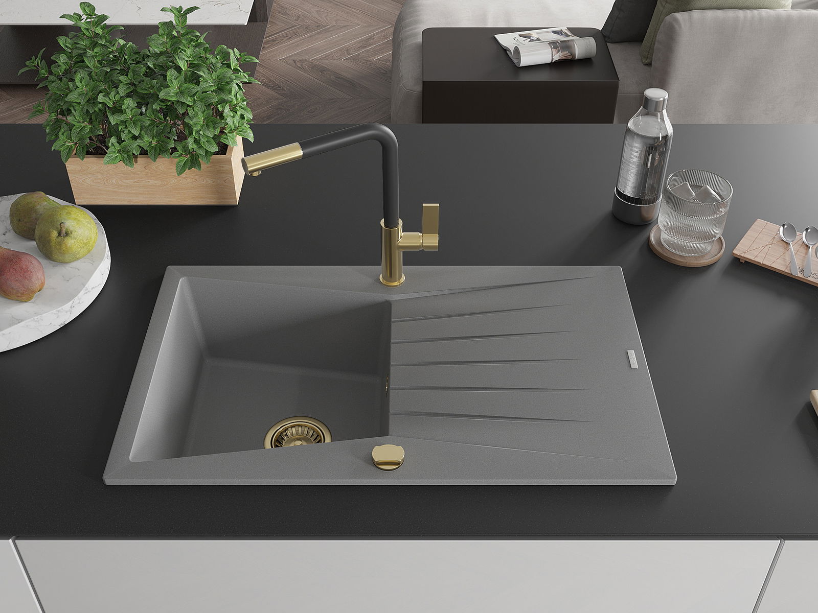 Mexen Cesar lava-loiça de granito com 1 cuba com escorredor e torneira de cozinha Flora, cinzento - 6514-71-670401-57-G
