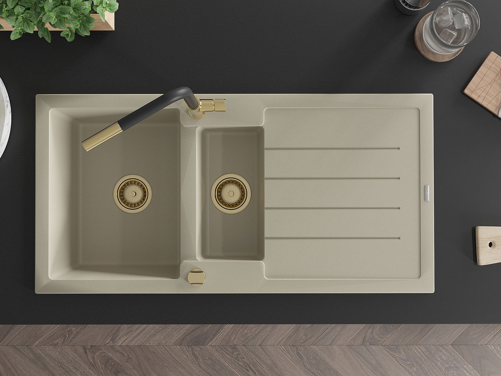 Mexen Andres lava-loiça de granito de 1,5 cubas com escorredor e torneira de cozinha Flora, bege - 6515-69-670401-57-G
