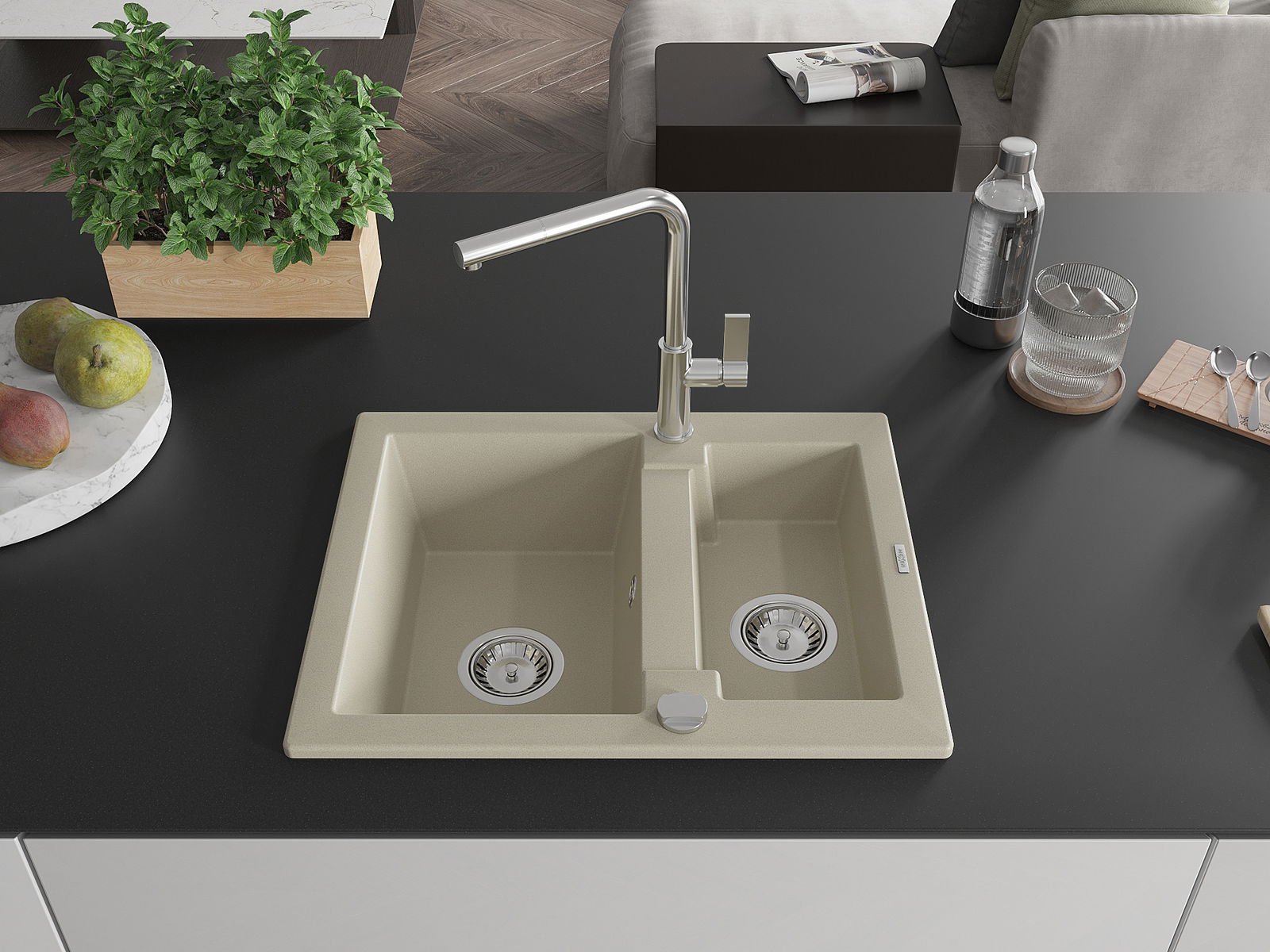Mexen Carlos lava-loiça de granito de 1,5 cubas com misturadora de cozinha Flora, bege - 6518-69-670401-00