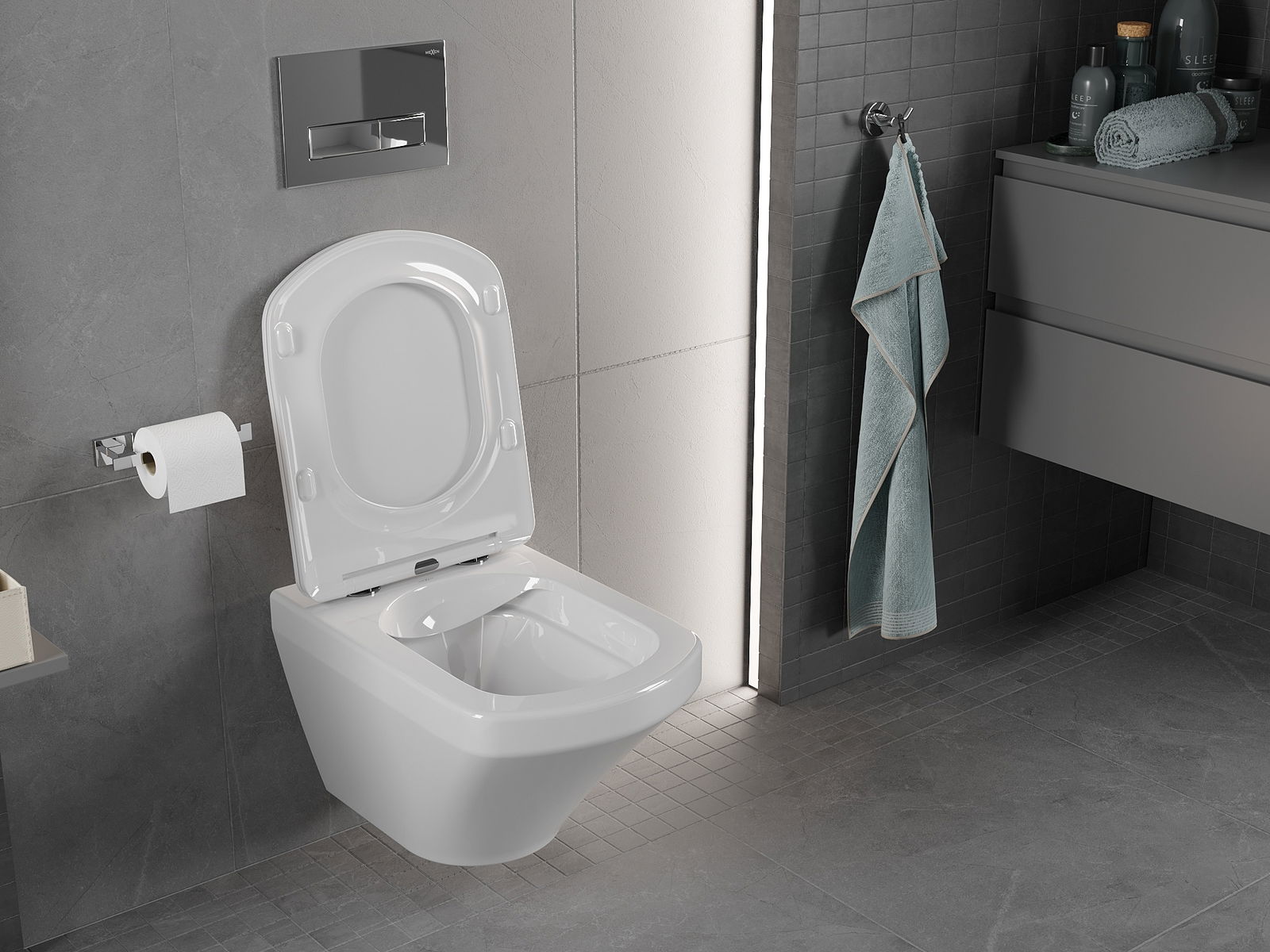 A tampa de queda lenta está equipada com um sistema especial que impede a sua queda rápida e súbita. O sistema elimina eficazmente o problema do bater da tampa e minimiza o ruído, assegurando um fechamento suave e silencioso da sanita.