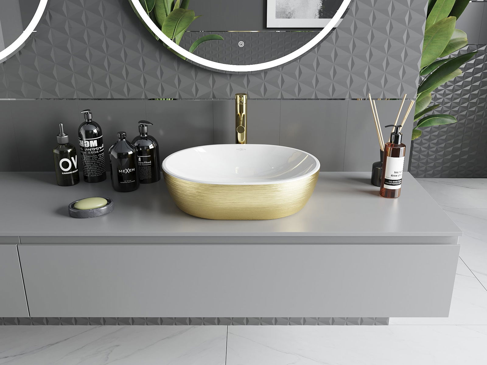 Mexen Viki lavatório de bancada 48 x 35 cm, branco/dourado padrão linhas - 21054817
