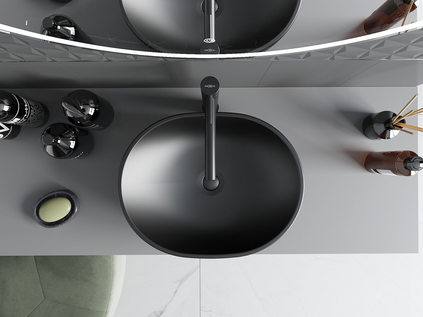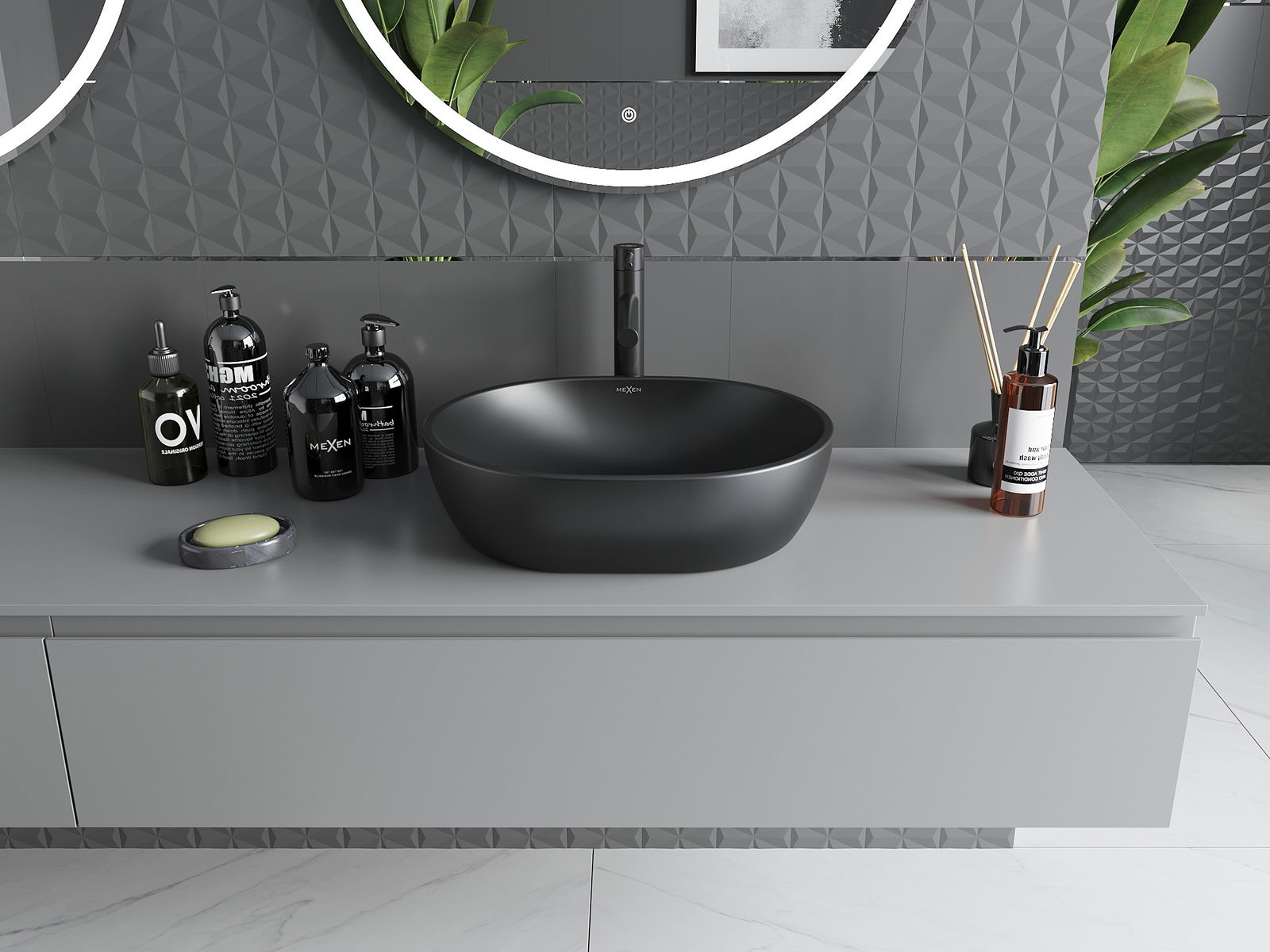 O lavatório Mexen Viki é a solução ideal para casas de banho modernas. Lavatório de bancada com as medidas de 48,5 x 35 cm em elegante cor preta mate impressiona com a sua forma oval e design minimalista. Feito de cerâmica sanitária de alta qualidade, oferece não só estética, mas também durabilidade. O revestimento protetor torna-o fácil de limpar, e a sua profundidade reduzida de 11,5 cm torna-o perfeito para pequenos espaços. A ausência de orifícios para torneiras permite qualquer arranjo.