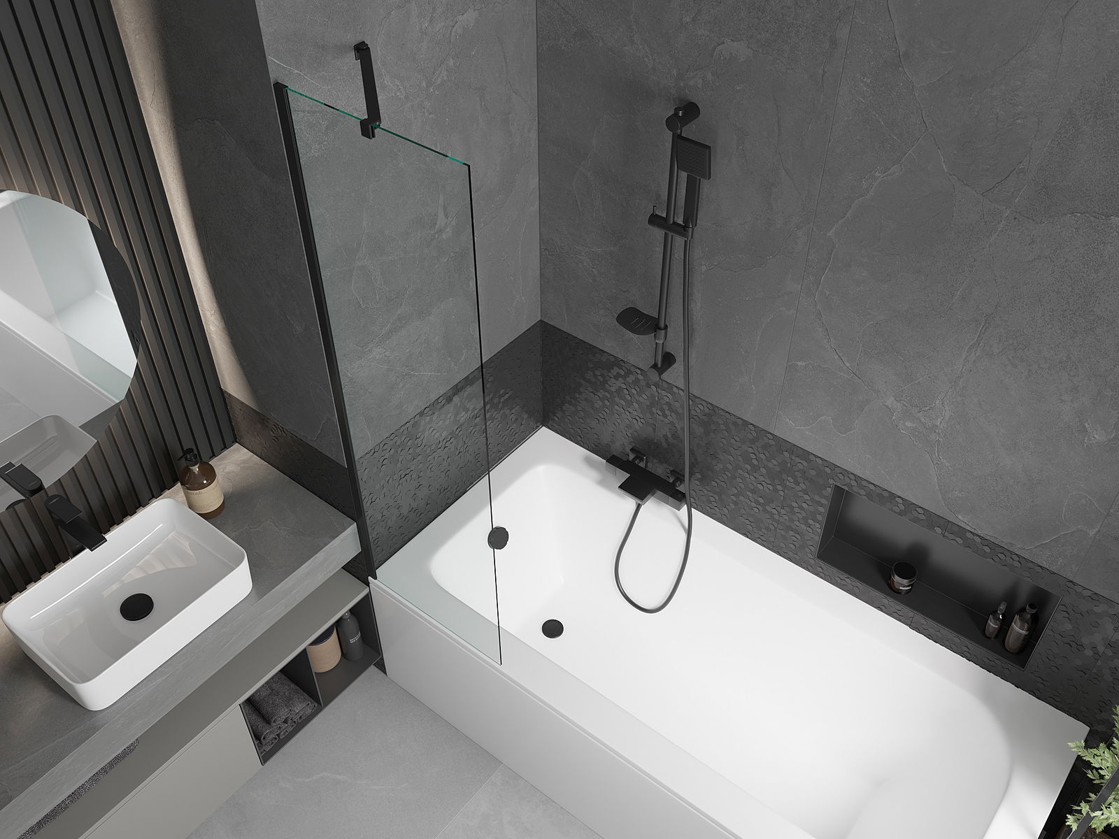 Proteção eficaz contra o derramamento de água durante o banho. O parapeito possui vedações que se ajustam perfeitamente à superfície do vidro e à borda da banheira. Solução funcional que garante segurança e fácil manutenção da limpeza.