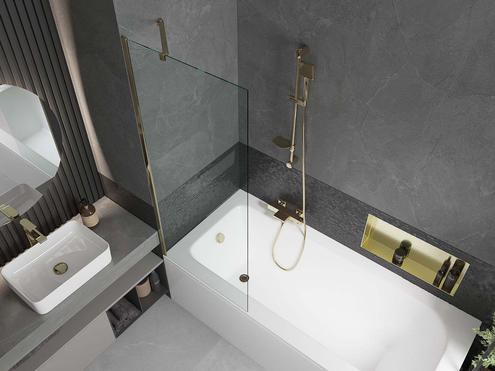 Proteção eficaz contra o derramamento de água durante o banho. O parapeito possui vedações que se ajustam perfeitamente à superfície do vidro e à borda da banheira. Solução funcional que garante segurança e fácil manutenção da limpeza.