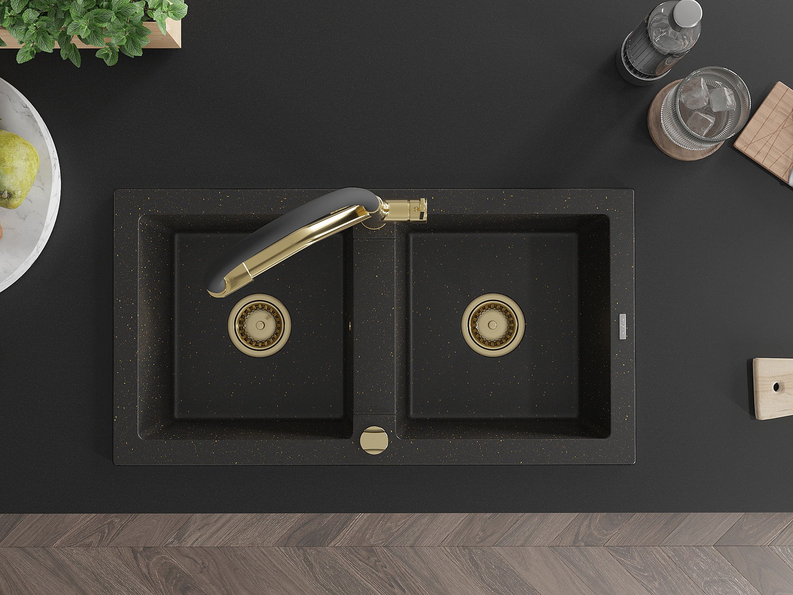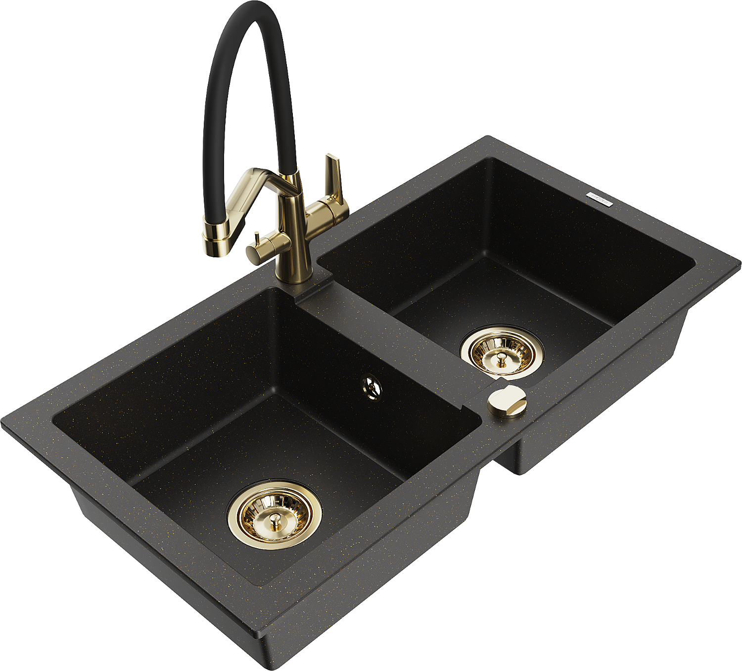 Mexen Mario lava-loiça de granito de 2 cubas com misturadora de cozinha Duo, preto/dourado metálico - 6504-75-671701-57-G