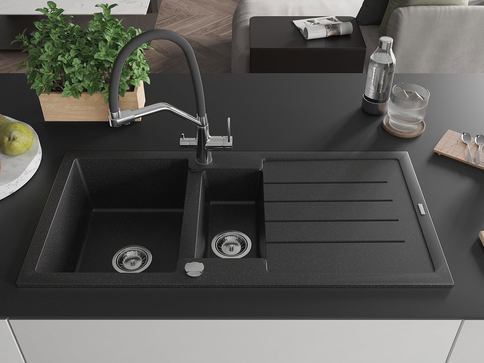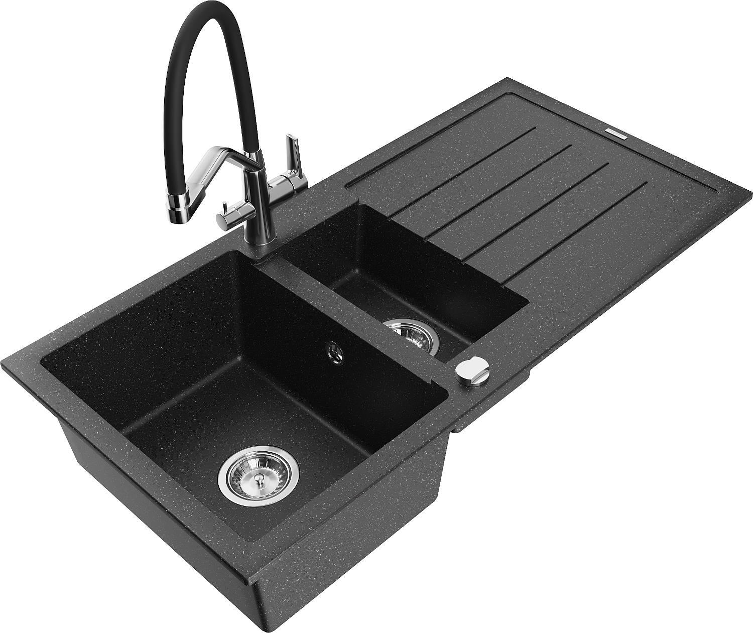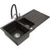 Mexen Andres lava-loiça de granito de 1,5 bacias com escorredor e torneira de cozinha Duo, preto/metalizado prateado