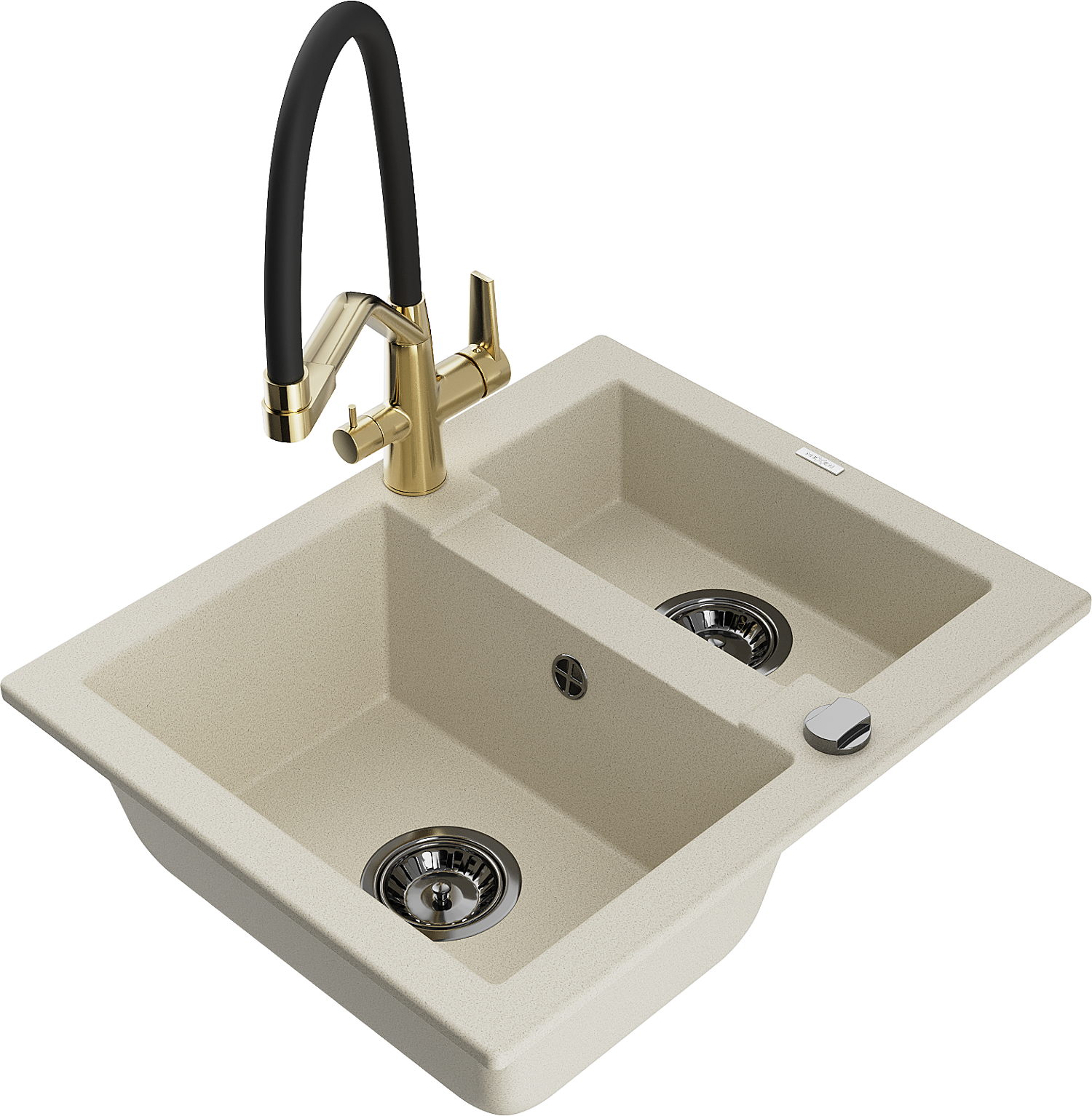 Mexen Carlos lava-loiça de granito com 1,5 bacias com torneira de cozinha Duo, bege - 6518-69-671701-57-B