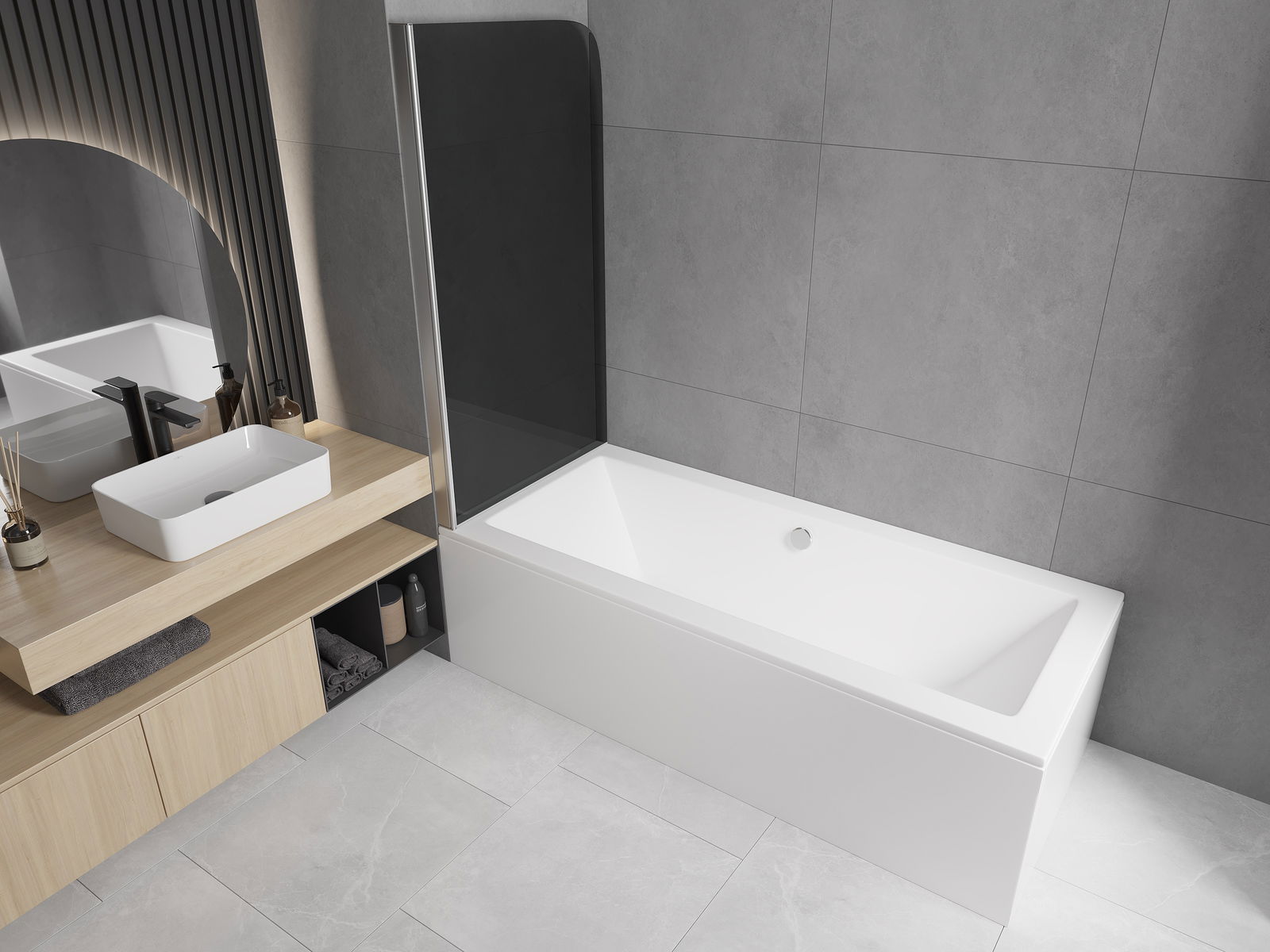 Proteção eficaz contra o derramamento de água durante o banho. O parapeito possui vedações que se ajustam perfeitamente à superfície do vidro e à borda da banheira. Solução funcional que garante segurança e fácil manutenção da limpeza.